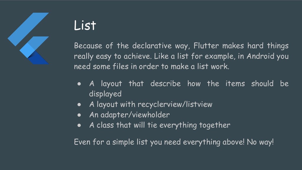 really easy to achieve. Like a list for example, in Android you need some files in order to make a list work. • A layout that describe how the items should be displayed • A layout with recyclerview/listview • An adapter/viewholder • A class that will tie everything together Even for a simple list you need everything above! No way!