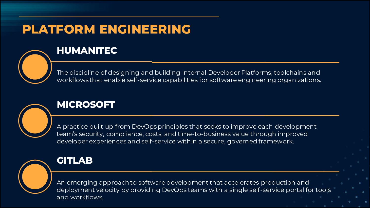 Developer Platforms, toolchains and workflows that enable self-service capabilities for software engineering organizations. MICROSOFT A practice built up from DevOps principles that seeks to improve each development team’s security, compliance, costs, and time-to-business value through improved developer experiences and self-service within a secure, governed framework. GITLAB An emerging approach to software development that accelerates production and deployment velocity by providing DevOps teams with a single self-service portal for tools and workflows.