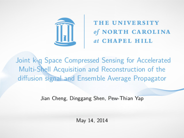 signal and propagator in joint k-q space. 6D-CS-dMRI has lower RMSE and more robust to noise than its naive way. 6D-CS-dMRI achieves RMSE about 5% by using 11-fold subsampling in k-q space. Future work: Acquire raw complex data in k-space. Sampling scheme in q-space: a subset of DSI scheme → multi-shell uniform sampling scheme. (poster id: 2558. Wednesday, 4pm-6pm. MICCAI 2014) Efficient implementation: parallel in different volumes and different voxels