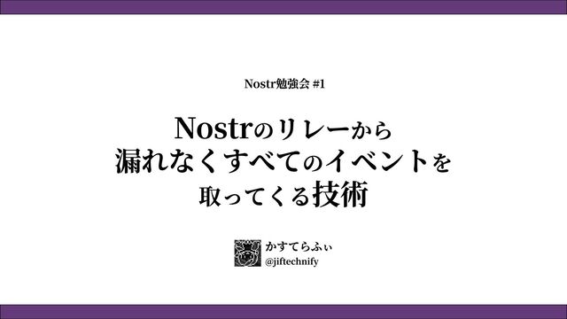 Nostrのリレーから 漏れなくすべてのイベントを 取ってくる技術 かすてらふぃ @jiftechnify Nostr勉強会 #1