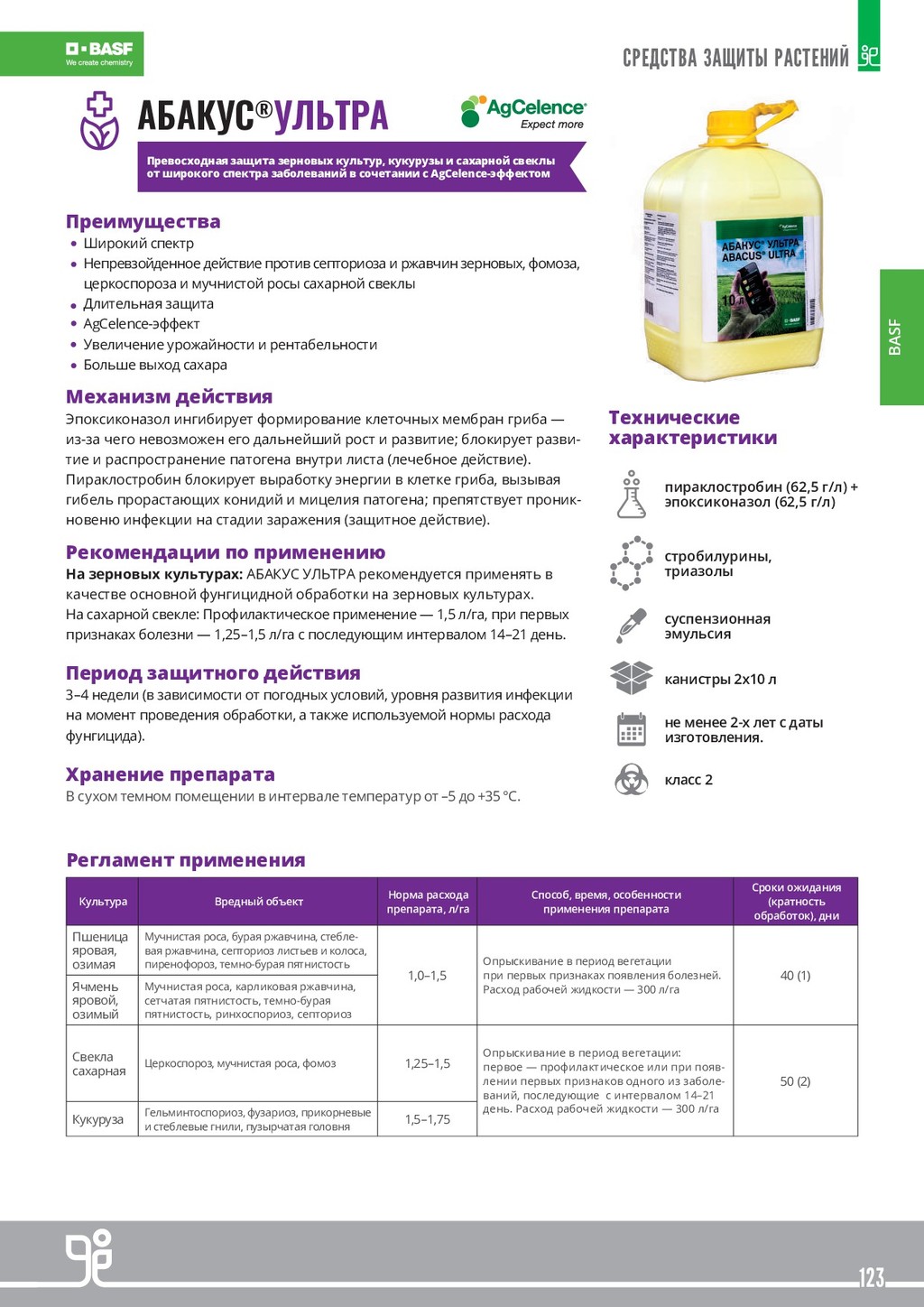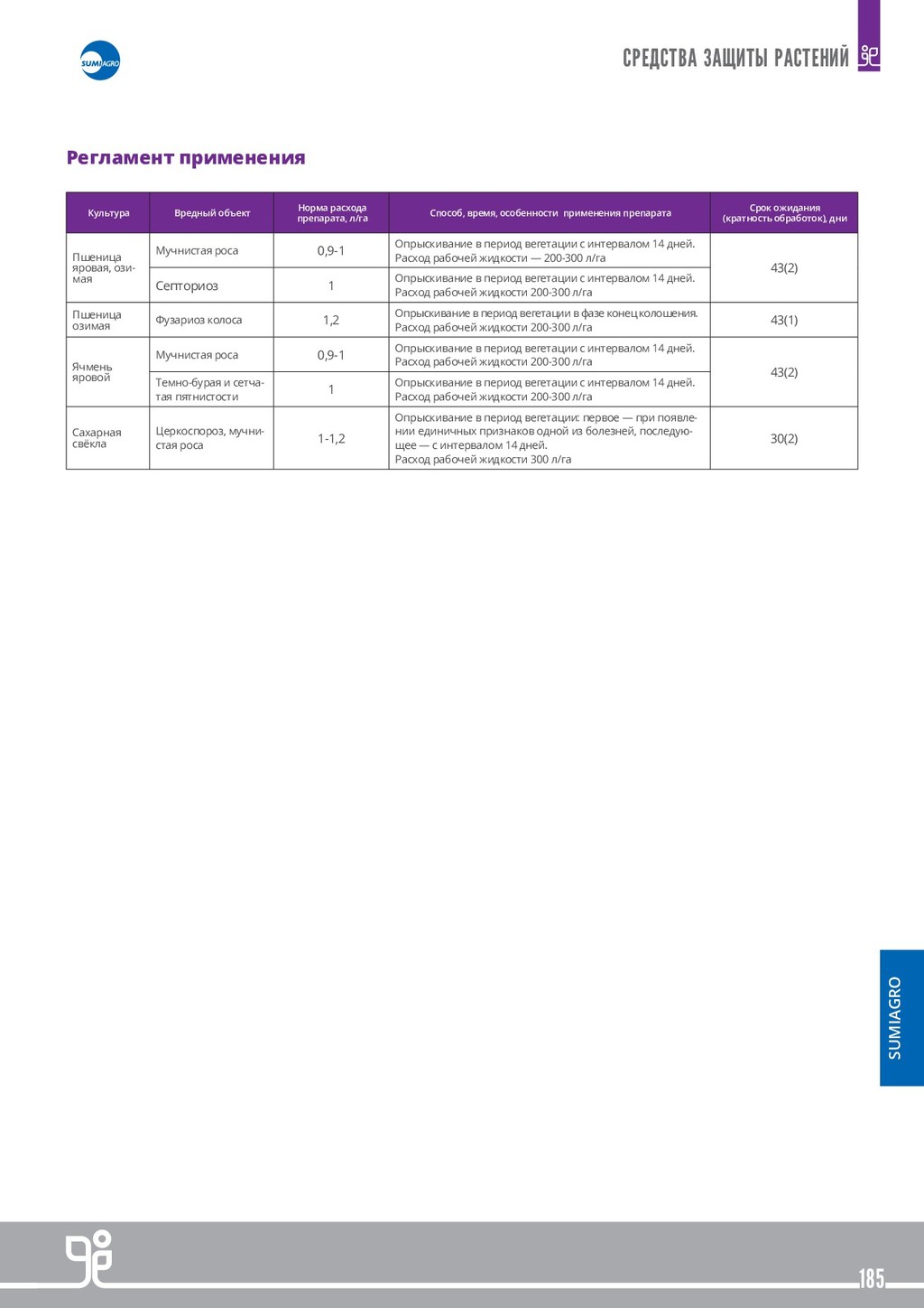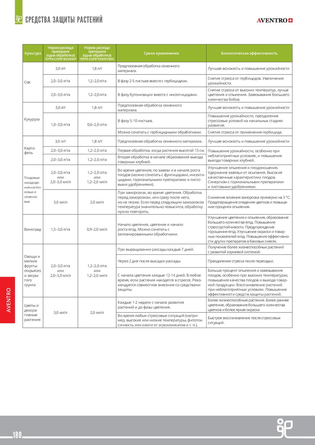ВЕЩЕСТВ В РАСТЕНИЯХ Многочисленные факторы влияют на способность растений поглощать питательные и другие вещества. Поэтому при определенных условиях у растений могут возникнуть проблемы с поглощением питательных речовны из почвы. К тому же, при внекорневой обработке как питательными веществами так и средствами защиты растений для обеспечения эффективности обработки необходимо быстрое усвоение действующих веществ. КАЧЕСТВО ПЛОДОВ В настоящее время рентабельность сельского хозяйства зависит не только от объема полученного урожая, но и от его качества. Качество фруктов и овощей определяется несколькими параметрами, включая размер, здоровое состояние и группу органолептических характеристик, которые приобретаются во время созревания и делают плоды аппетитными (цвет, вкус, аромат и структура). Другие показатели, такие как однородность и раннее созревание, также важны для про- изводителя с точки зрения рыночных условий. Регламент применения Культура Норма расхода препарата (одна обработка) ТЕРРА-СОРБ®ФОЛИАР Норма расхода препарата (одна обработка) ТЕРРА-СОРБ®КОМПЛЕКС Сроки применения Биологическая эффективность Озимый рапс 9,0 л/т 5,4 л/т Предпосевная обработка семенного материала. Лучшая всхожесть и повышение урожайности 2,0–3,0 л/га 1,2–2,0 л/га Осень: вместе с регуляторами роста, если дневная температура минимум +8 ° С. Без регуляторов ро- ста, если дневная температура не ниже + 5 ° С. Улучшенная зимостойкость и развитая корне- вая система, жизнеспособность и энергия отрастания весной. 2,0–3,0 л/га 1,2–2,0 л/га Весна: при возобновлении вегетации и наличии листовой массы в баковых смесях с запланиро- ванными обработками. Повышение жизнеспособности и энергии отрастания при пониженных температурах весной. Образование большего количества ветвей. В период бутонизации вместе с инсектицидными обработками. Улучшение цветения и опыления, закладка большего количества стручков. Озимые пшениця, ячмень, рожь 3,0 л/т 1,8 л/т Предпосевная обработка семенного материала. Лучшая всхожесть и повышение урожайности 1,0–3,0 л/га 0,6–2,0 л/га Осень от фазы 3-х листьев до начала фазы куще- ния, при дневной температуре не ниже + 5 ° С. Лучшие кущение и зимостойкость. Повышенная энергия отрастания весной. 1,0–3,0 л/га 0,6–2,0 л/га Весна: при возобновлении вегетации, в баковых смесях с запланированными обработками. Усиление кущения, повышенная эффективность обработок. Увеличение количества зерен в колосе. Вместе с фунгицидами по флаговому листу. Поддержка флагового листа и цветения. Яровой рапс 2,0–3,0 л/га 1,2–2,0 л/га Вместе с гербицидами в начале роста стебля (4-5 листьев). Снятие стресса от гербицидов и повышения урожайности. 1,0–3,0 л/га 0,6–2,0 л/га В период бутонизации вместе с инсектицидными обработками. Улучшение цветения и опыления, з акладки большего количества стручков. Яровые пшеница, ячмень, рожь 3,0 л/т 1,8 л/т Предпосевная обработка семенного материала. Лучшая всхожесть и повышение урожайности 1,0–3,0 л/га 0,6–2,0 л/га В ранние фазы кущения вместе с запланирован- ными обработками. Вмомент смыкания междурядий или вместе с поздними обработками фунгицидами. Сахарная свекла 2,0–3,0 л/га 1,2–2,0 л/га Фаза 4-8 листьев. Преодоление стресса от воздействия гербицидов и неблагоприятных условий роста. Для обработки после гербицидов нужно дождаться отмирания сорняков. Можно сочетать с л