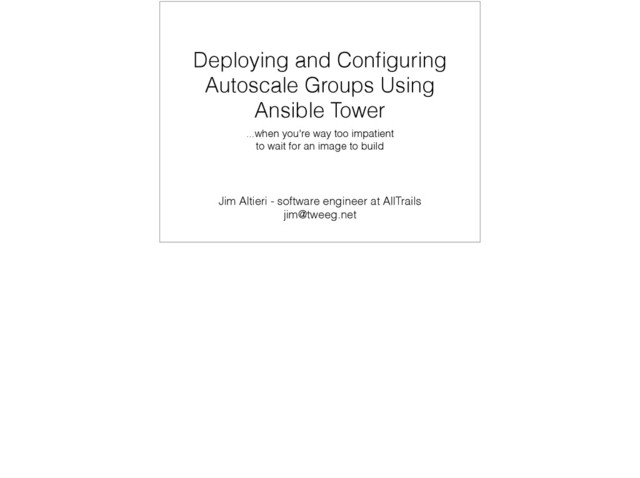• Docker? (the containers still need to be provisioned - just passing the buck) The traditional route is by “baking” an AMI for each of your box types, and just using that AMI in your LaunchConfiguration. Aminator - outdated, limited to certain linux dists Packer - slow. The workflow is to spin up a box, provision it, image it. Docker - haven’t looked into it, but seems promising as an extra layer of abstraction / indirection between code and the infrastructure it’s running on