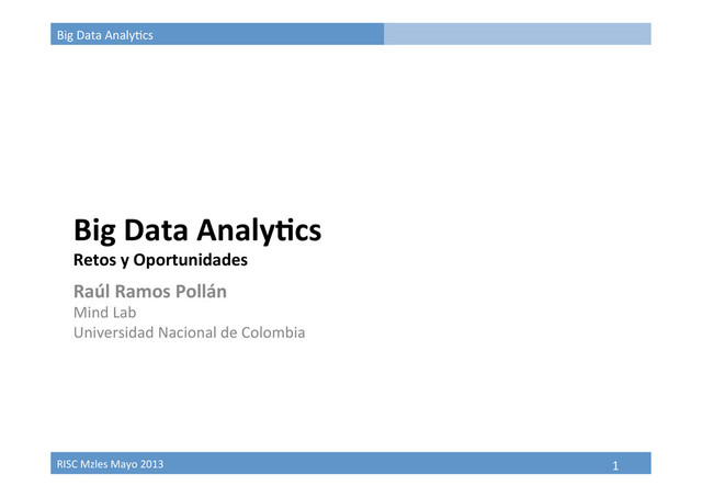 • DBA à aprende a tratar con datos no estructurados • Estadís9co à aprende a tratar con información que no cabe en memoria • Ingeniero sw à aprente modelado estadís9co y a comunicar los resultados a los expertos del dominio • Experto de un dominio à aprende algoritmos y los compromisos según aumenta la escala de tu problema El camino hacia big data