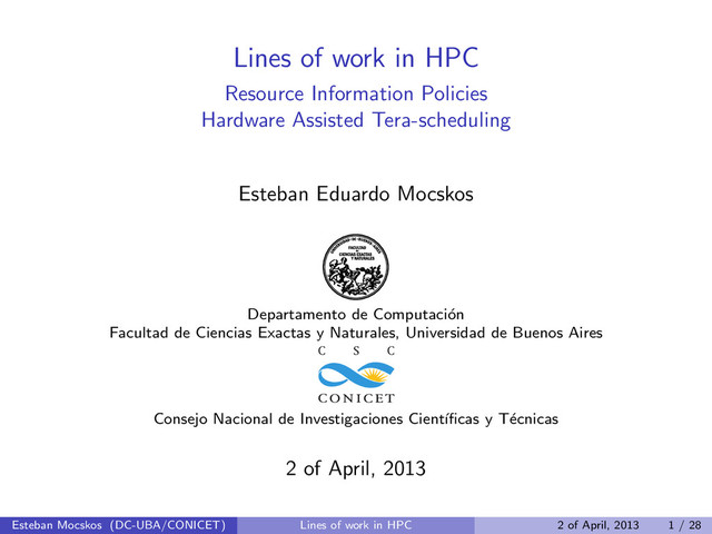 Tera-scheduling Esteban Eduardo Mocskos Departamento de Computaci´ on Facultad de Ciencias Exactas y Naturales, Universidad de Buenos Aires Consejo Nacional de Investigaciones Cient´ ıficas y T´ ecnicas 2 of April, 2013 Esteban Mocskos (DC-UBA/CONICET) Lines of work in HPC 2 of April, 2013 1 / 28