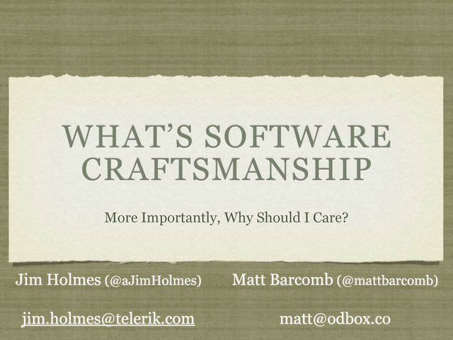 Testers can learn a great deal from the software craftsmanship movement. This talk, given with Matt Barcomb at CAST 2013, shows some great examples of things testers can learn from developers--and what devs can learn from testers.