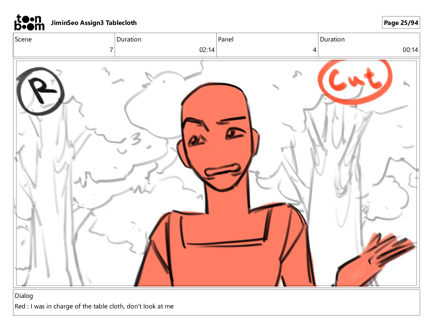 Scene 14 Duration 02:05 Panel 4 Duration 00:23 Dialog Red