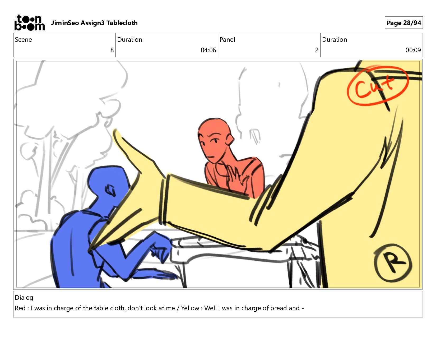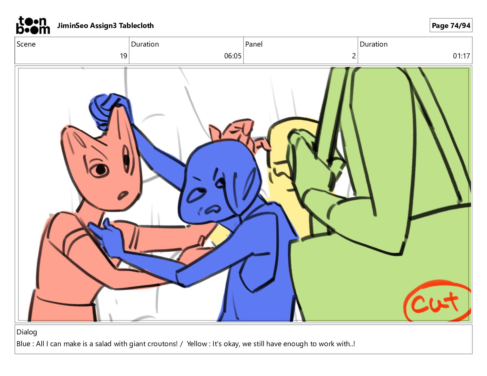 : All I can make is a salad with giant croutons! / Yellow : It's okay, we still have enough to work with..! JiminSeo Assign3 Tablecloth Page 74/94