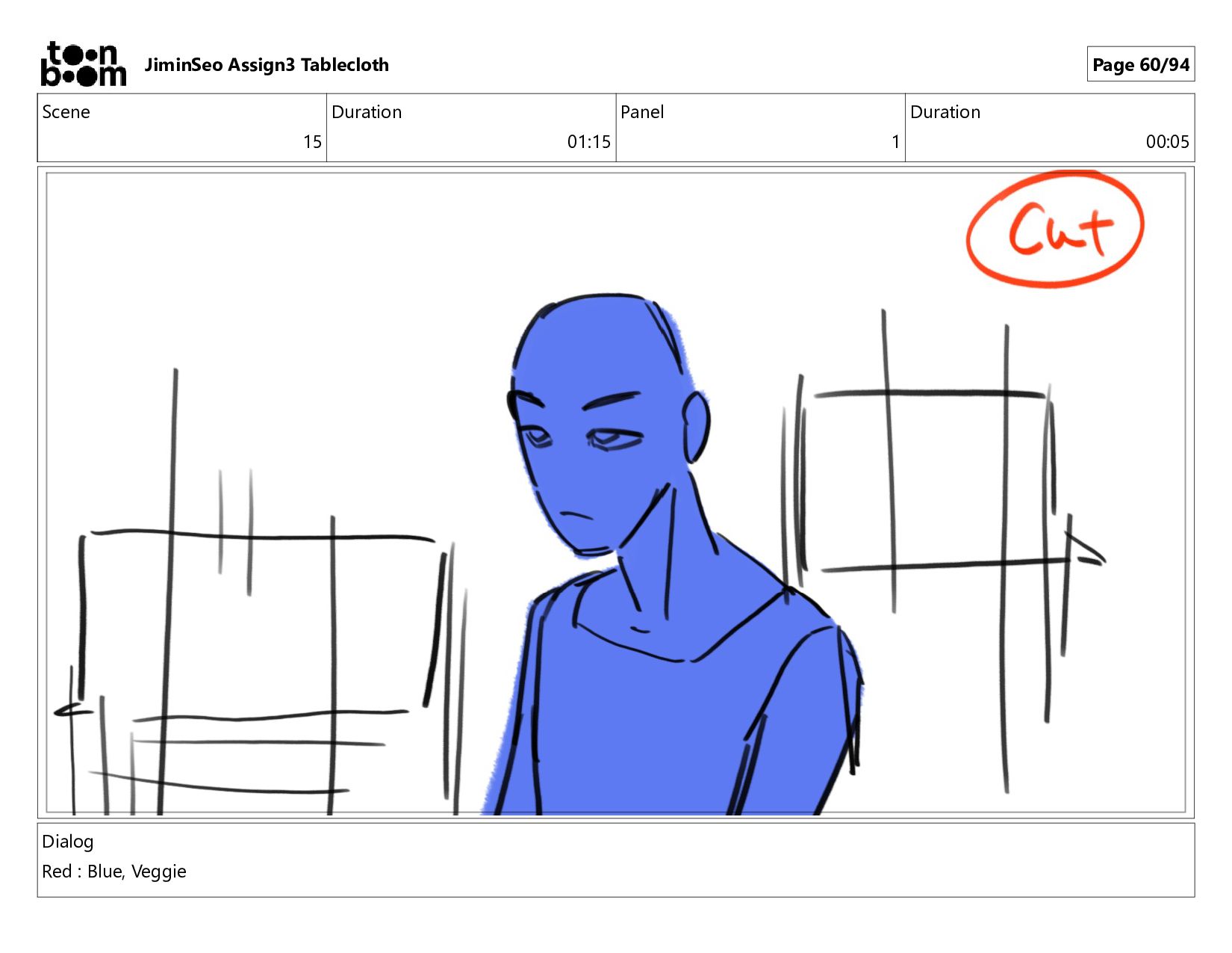Scene 15 Duration 01:15 Panel 1 Duration 00:05 Dialog Red