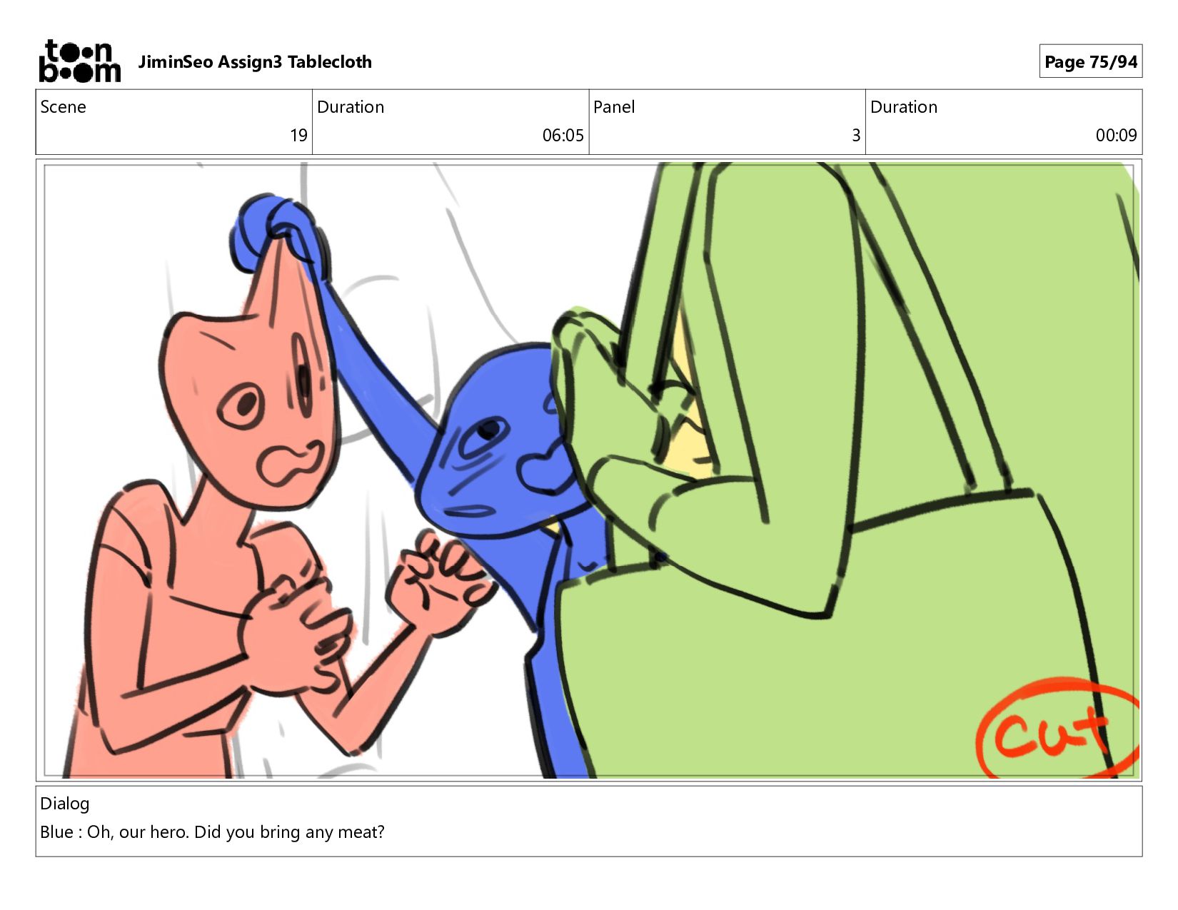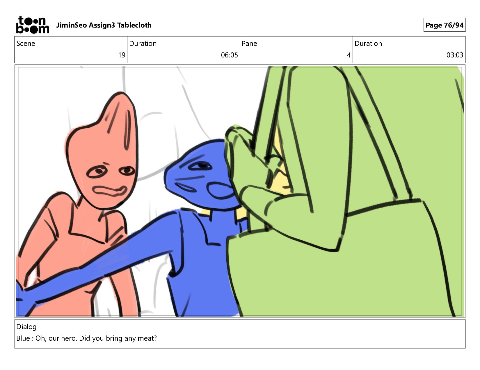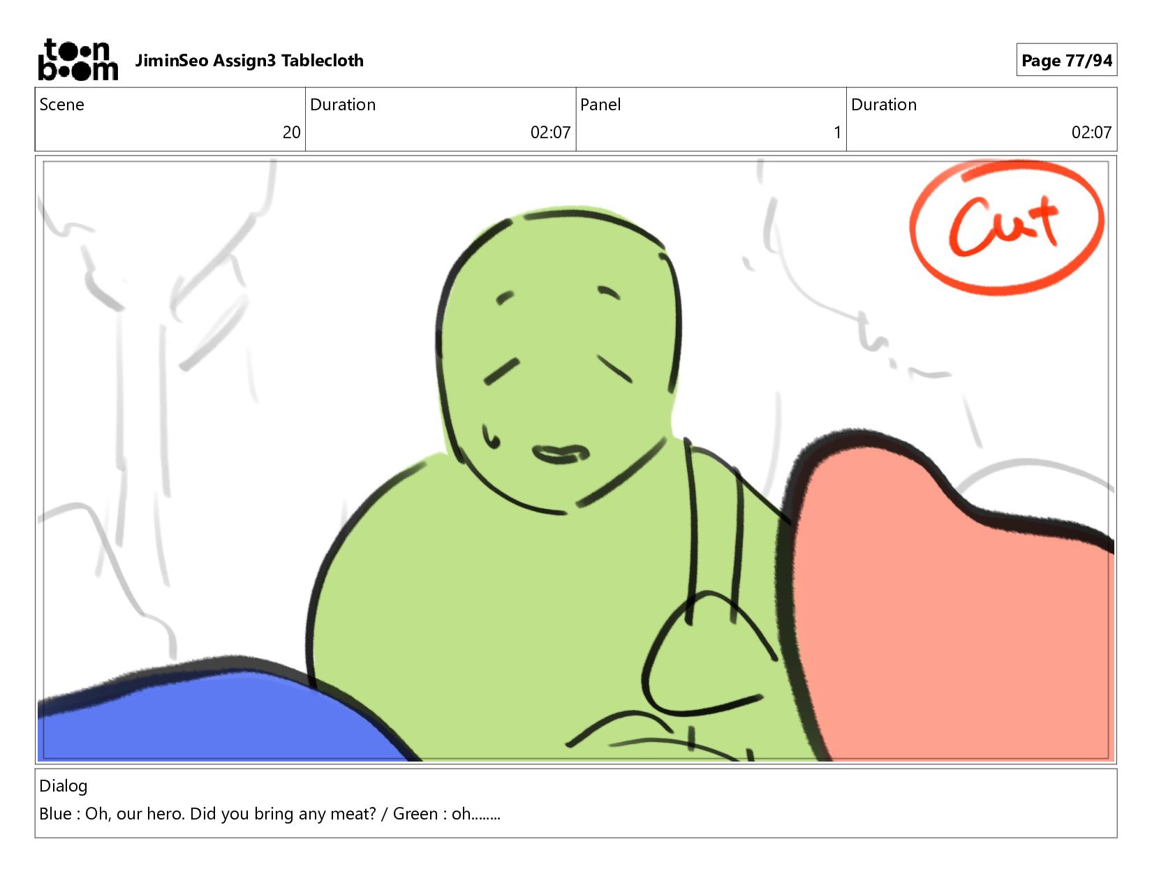 : Oh, our hero. Did you bring any meat? / Green : oh........ JiminSeo Assign3 Tablecloth Page 77/94