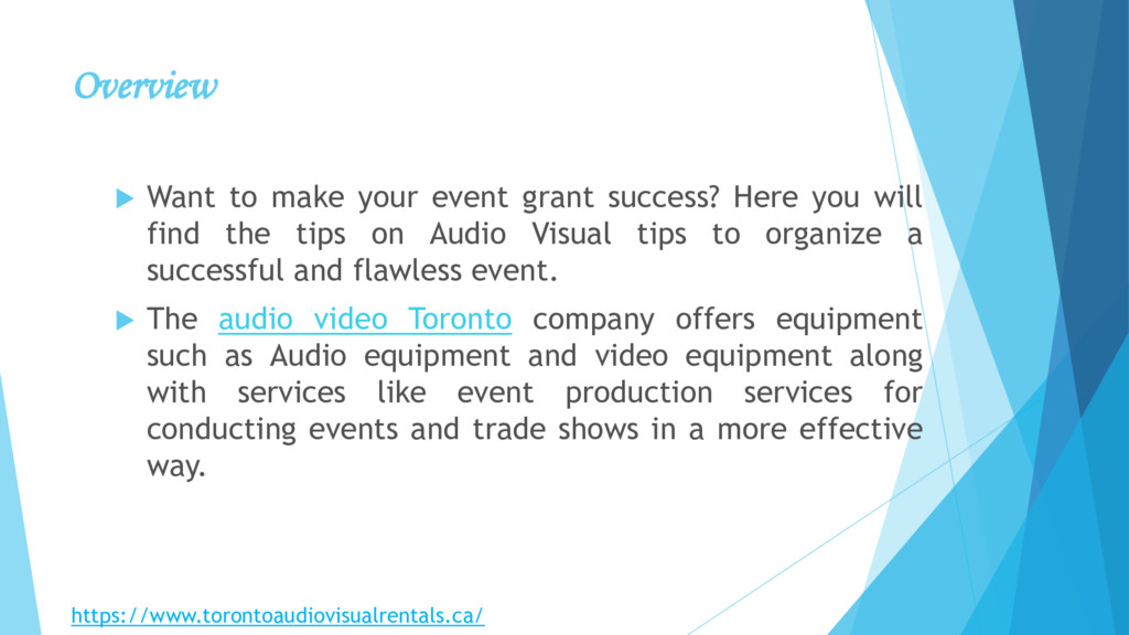 you will find the tips on Audio Visual tips to organize a successful and flawless event. The audio video Toronto company offers equipment such as Audio equipment and video equipment along with services like event production services for conducting events and trade shows in a more effective way. https://www.torontoaudiovisualrentals.ca/