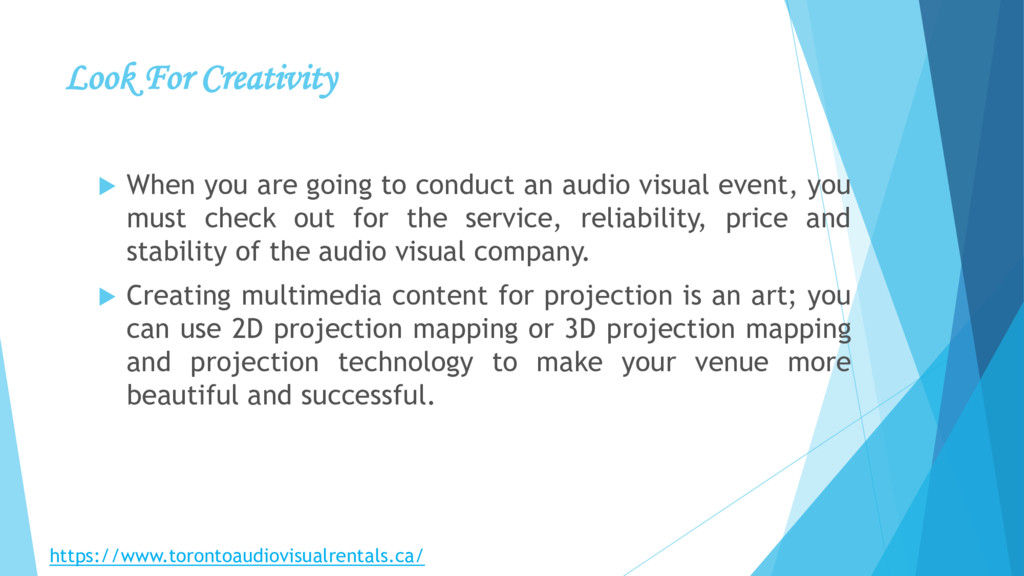 an audio visual event, you must check out for the service, reliability, price and stability of the audio visual company. Creating multimedia content for projection is an art; you can use 2D projection mapping or 3D projection mapping and projection technology to make your venue more beautiful and successful. https://www.torontoaudiovisualrentals.ca/