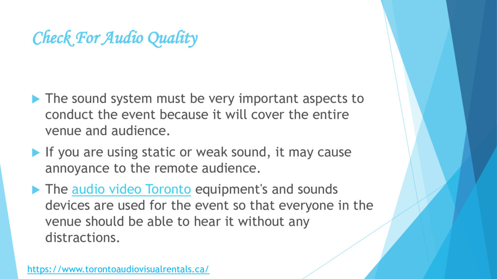 very important aspects to conduct the event because it will cover the entire venue and audience. If you are using static or weak sound, it may cause annoyance to the remote audience. The audio video Toronto equipment's and sounds devices are used for the event so that everyone in the venue should be able to hear it without any distractions. https://www.torontoaudiovisualrentals.ca/