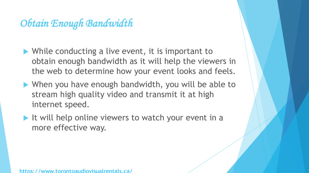 is important to obtain enough bandwidth as it will help the viewers in the web to determine how your event looks and feels. When you have enough bandwidth, you will be able to stream high quality video and transmit it at high internet speed. It will help online viewers to watch your event in a more effective way.