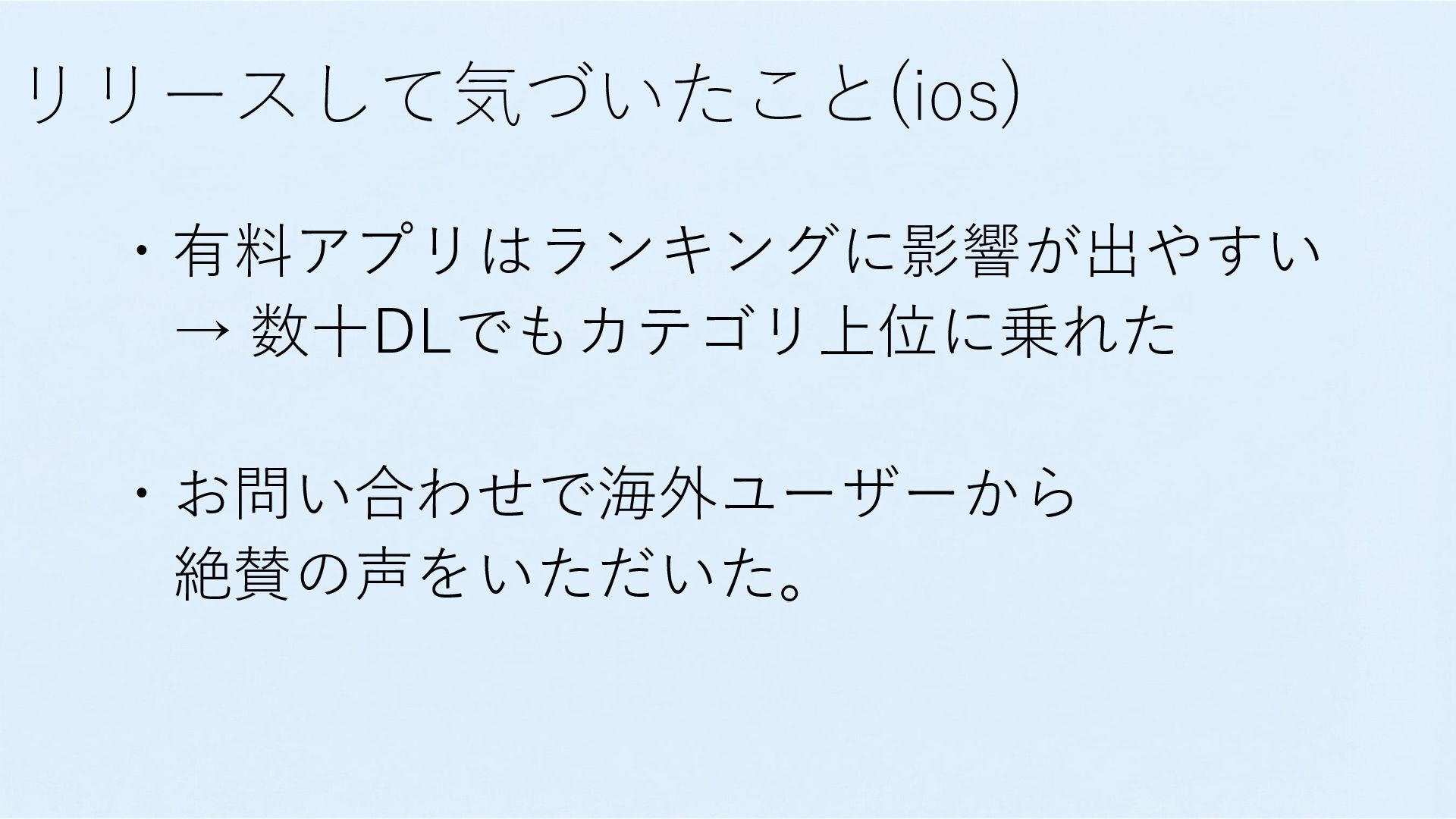 リリースして気づいたこと(ios) ・有料アプリはランキングに影響が出やすい → 数十DLでもカテゴリ上位に乗れた ・お問い合わせで海外ユーザーから 絶賛の声をいただいた。