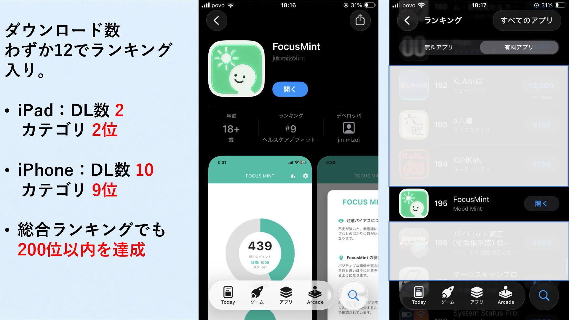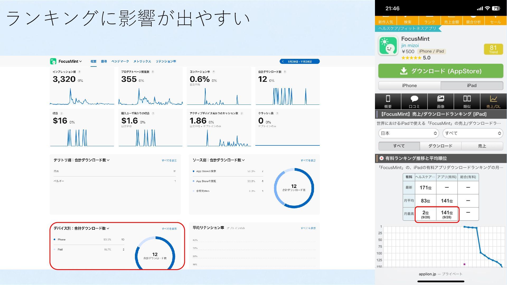 ダウンロード数 わずか12でランキング 入り。 • iPad:DL数 2 カテゴリ 2位 • iPhone:DL数