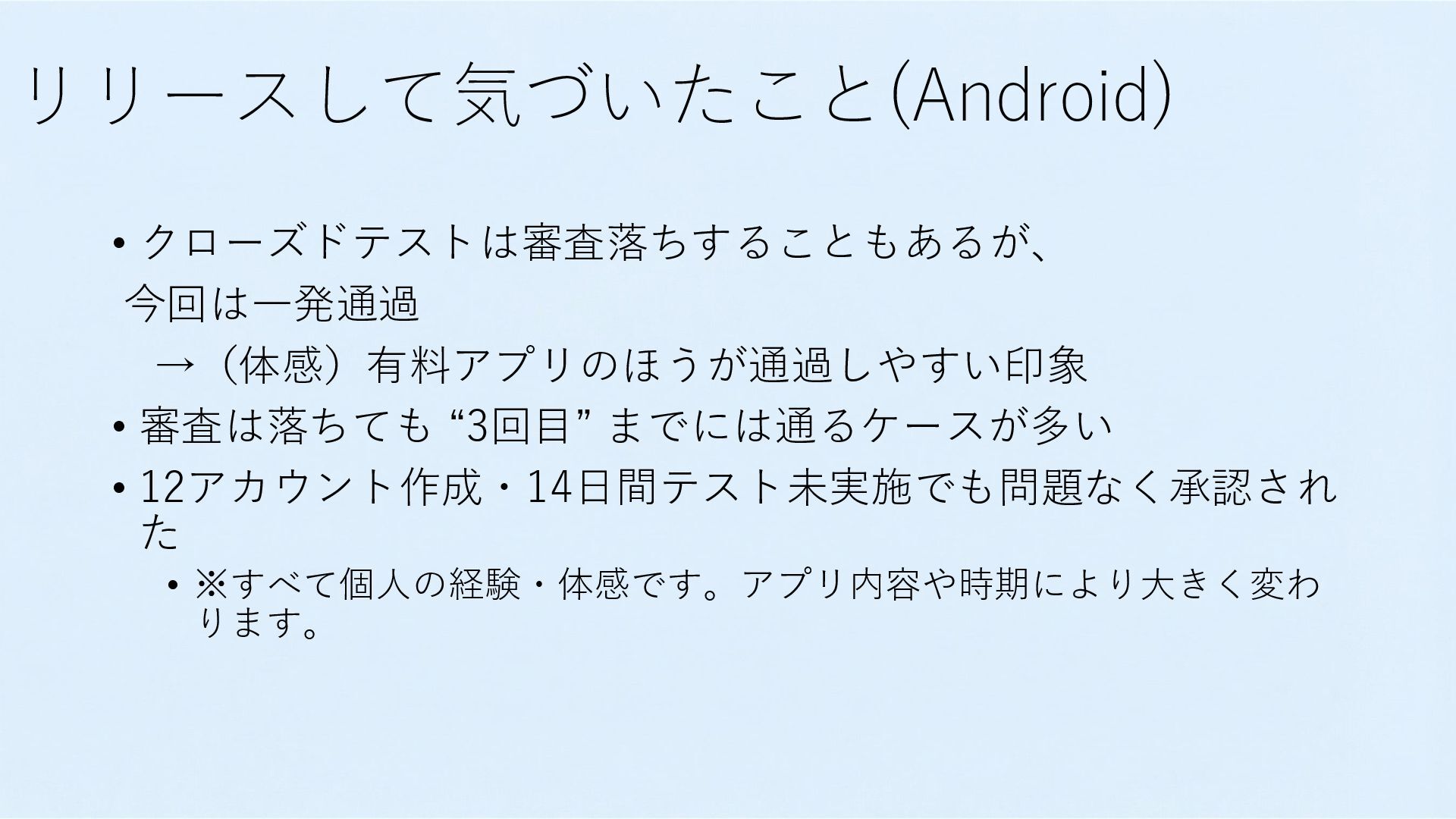 リリースして気づいたこと(Android) • クローズドテストは審査落ちすることもあるが、 今回は一発通過 →(体感)有料アプリのほうが通過しやすい印象 • 審査は落ちても “3回目” までには通るケースが多い •