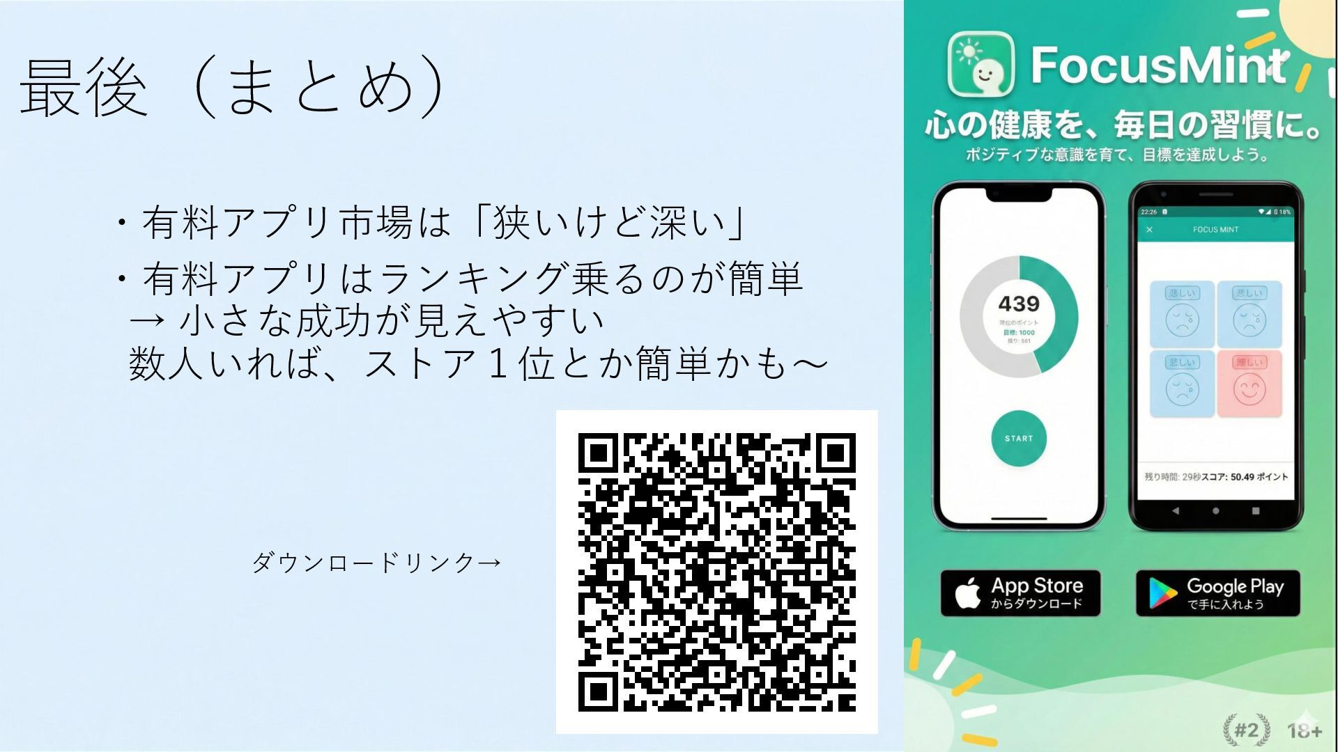 最後(まとめ) ・有料アプリ市場は「狭いけど深い」 ・有料アプリはランキング乗るのが簡単 → 小さな成功が見えやすい 数人いれば、ストア1位とか簡単かも〜 ダウンロードリンク→