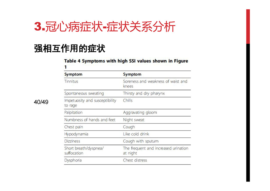 药物2 8 9 14 19 13 17 发热缓解平均值 44.27 43.69 30.43 55.13 41.71 39.57 发热缓解中位数 30 30 24 48 30 24 发热缓解有效率 0.3902 0.3906 0.7857 0.2813 0.4677 0.5946 注:药物1和药物2中一个是中药,一个是西药,例如3是退热药,14是双黄连制剂 • 分析特定中药和西药共用的疗效 • 一般地,中药和西药共用,疗效一般会下降 药物1 3 14 3 药物2 14 发热缓解平均值 45.10 26.91 30.43 发热缓解中位数 36 24 24 发热缓解有效率 0.3652 0.7429 0.7857