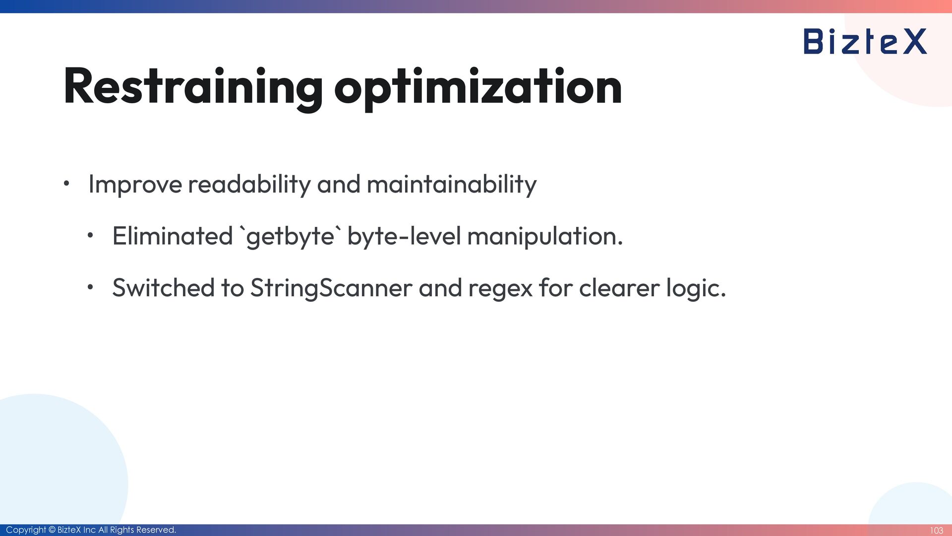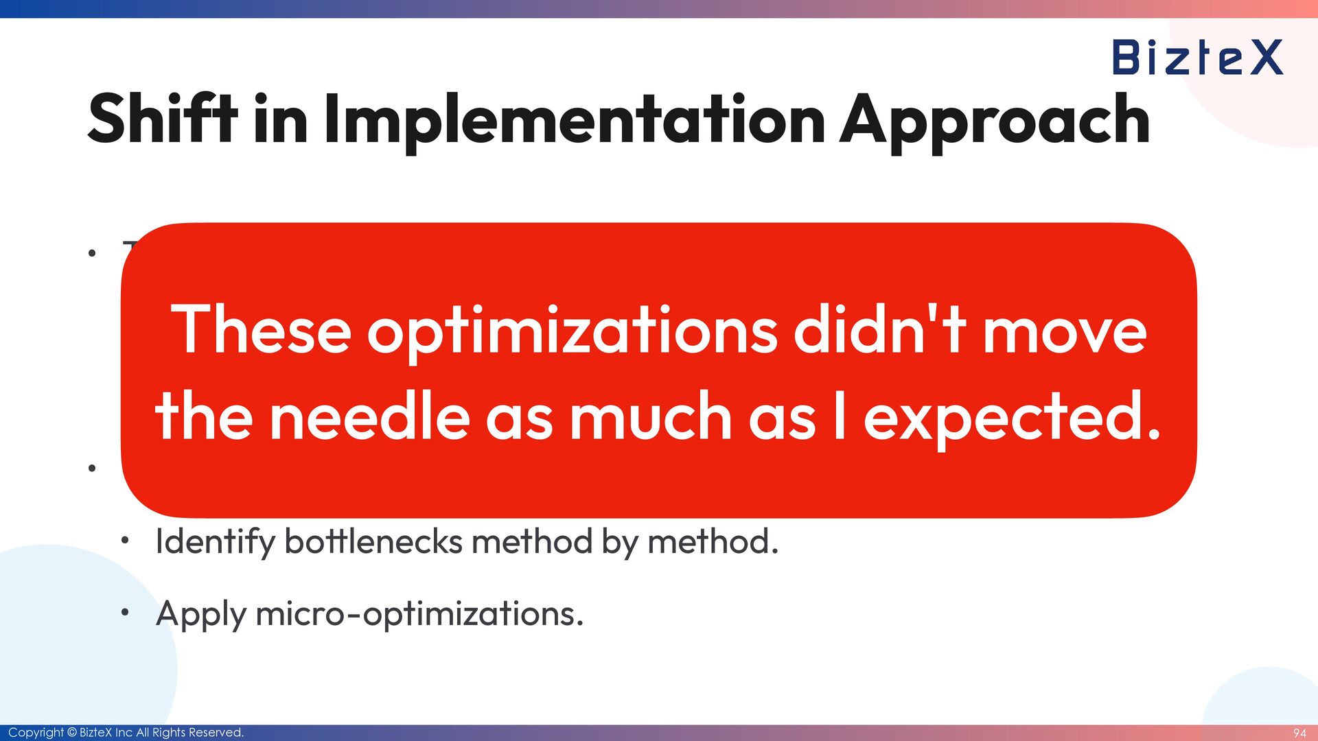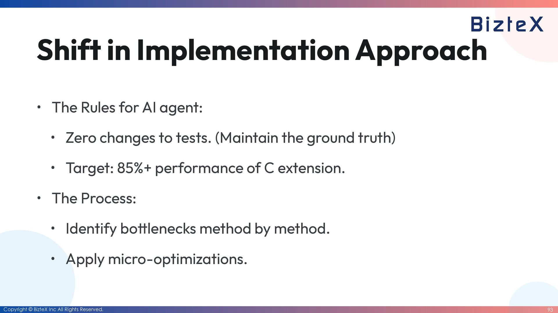 Implementation Approach • The Rules for AI agent: • Zero changes to tests. (Maintain the ground truth) • Target: 85%+ performance of C extension. • The Process: • Identify bo tt lenecks method by method. • Apply micro-optimizations.