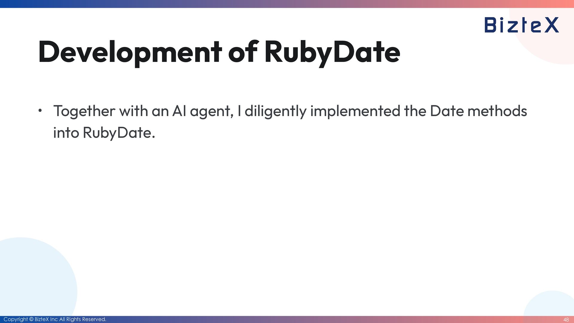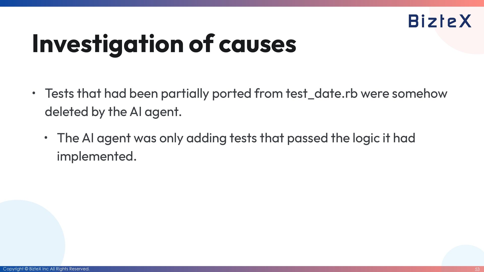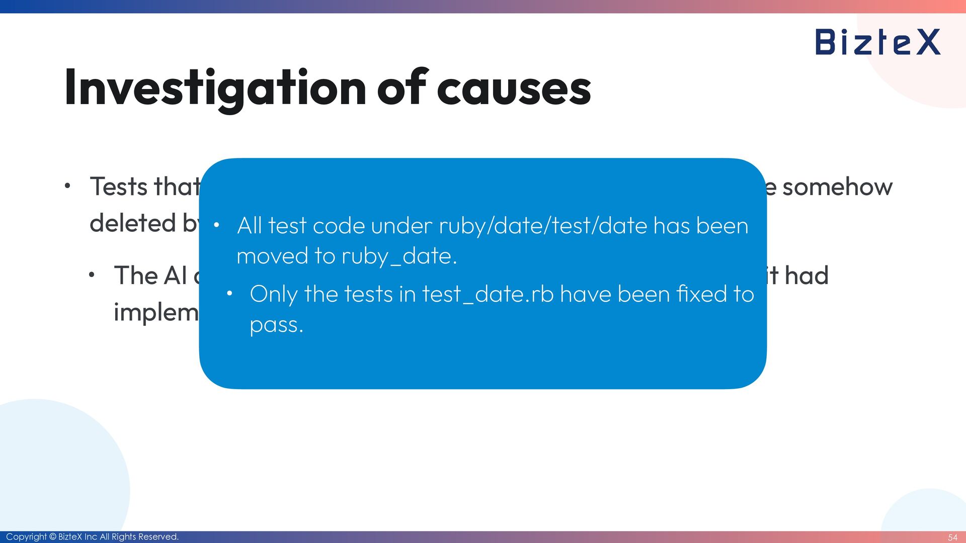 causes • Tests that had been partially ported from test_date.rb were somehow deleted by the AI agent. • The AI agent was only adding tests that passed the logic it had implemented. • All test code under ruby/date/test/date has been moved to ruby_date. • Only the tests in test_date.rb have been fi xed to pass.