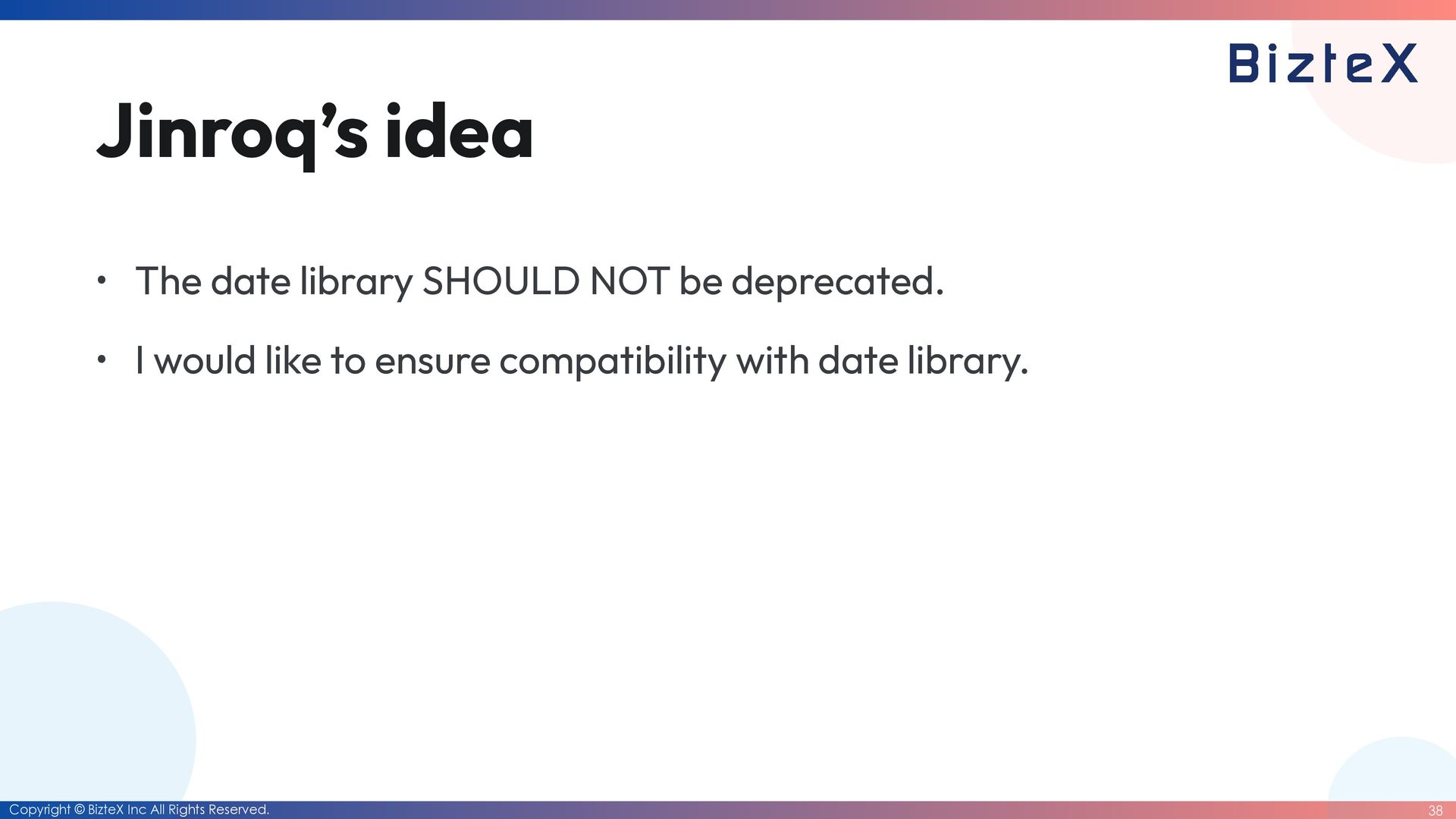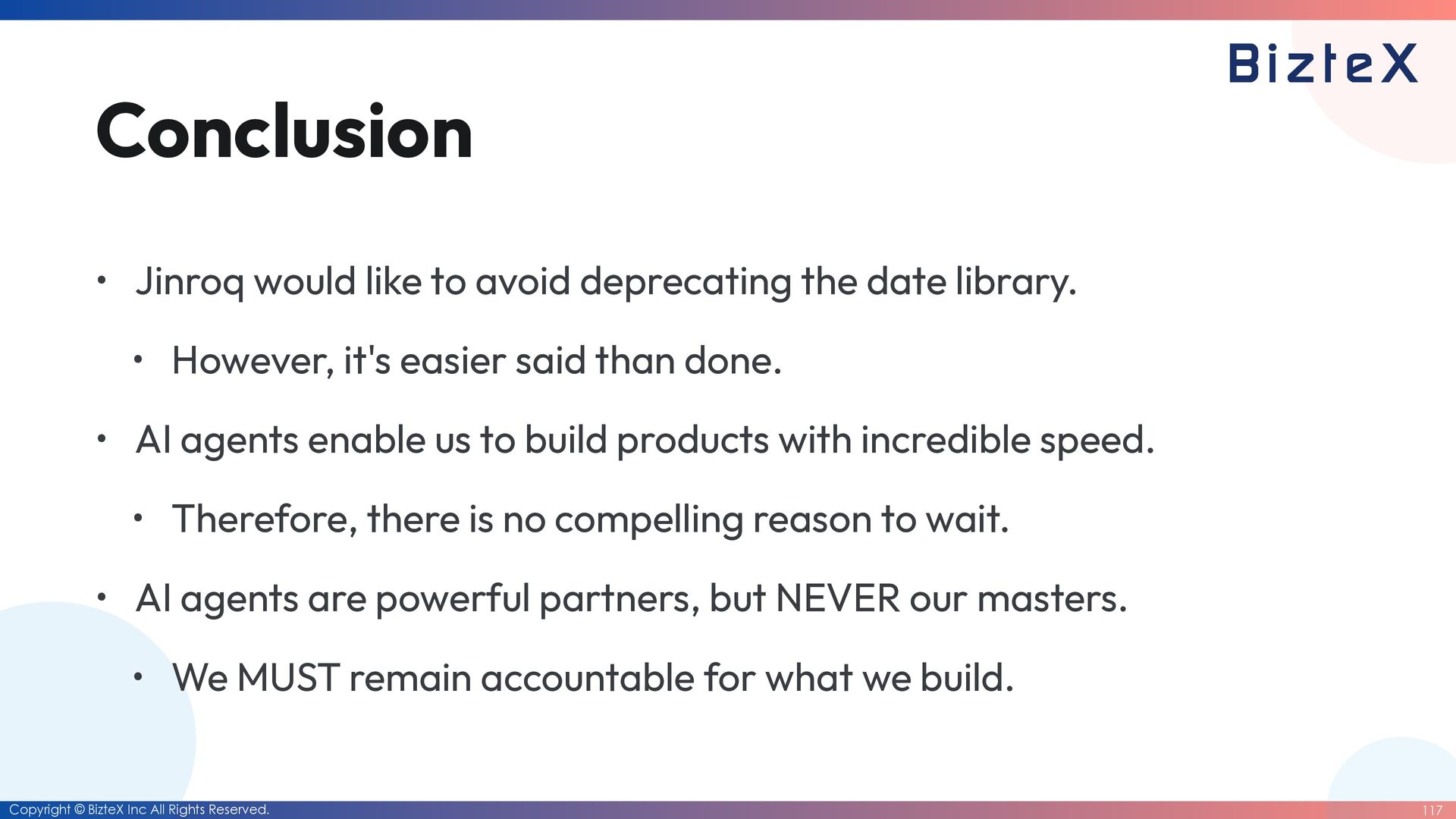 Jinroq would like to avoid deprecating the date library. • However, it's easier said than done. • AI agents enable us to build products with incredible speed. • Therefore, there is no compelling reason to wait. • AI agents are powerful partners, but NEVER our masters. • We MUST remain accountable for what we build.