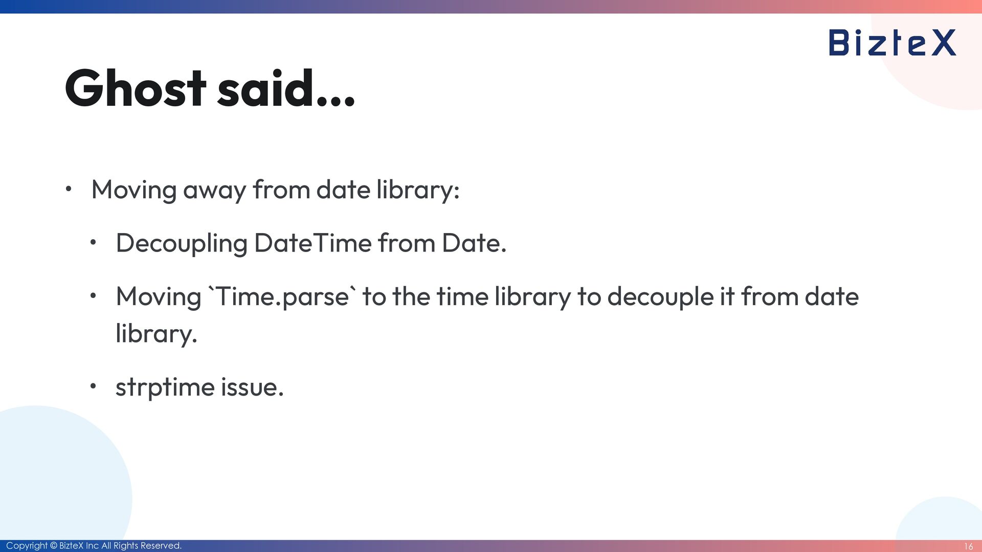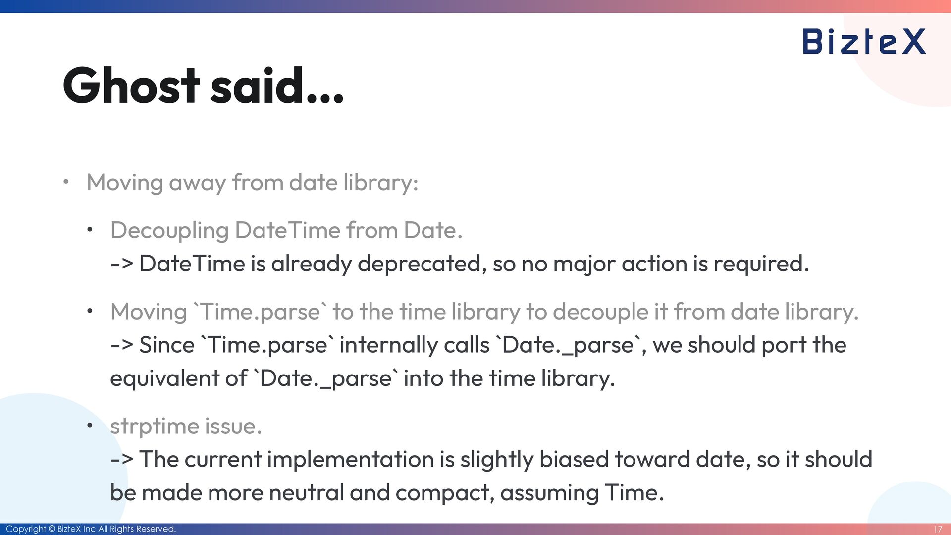 • Moving away from date library: • Decoupling DateTime from Date. • Moving `Time.parse` to the time library to decouple it from date library. • strptime issue.
