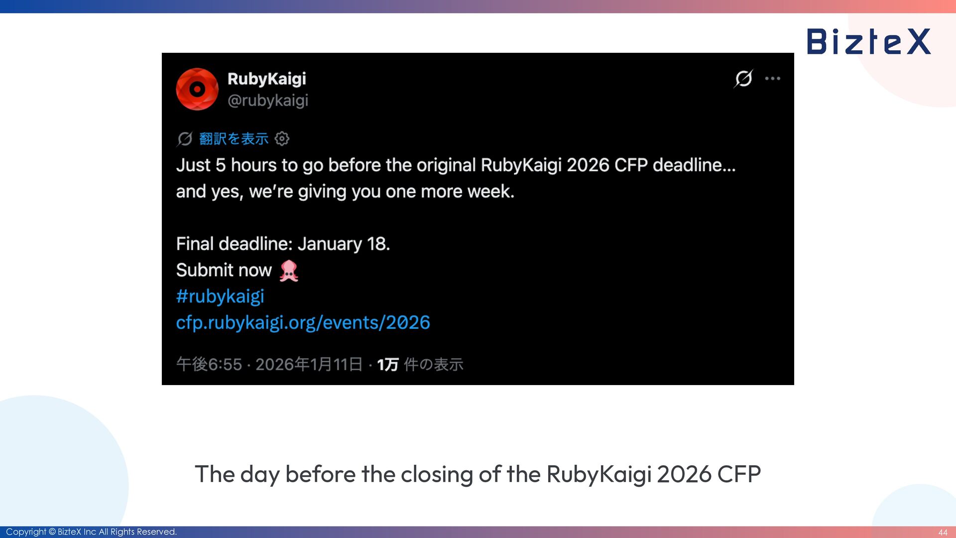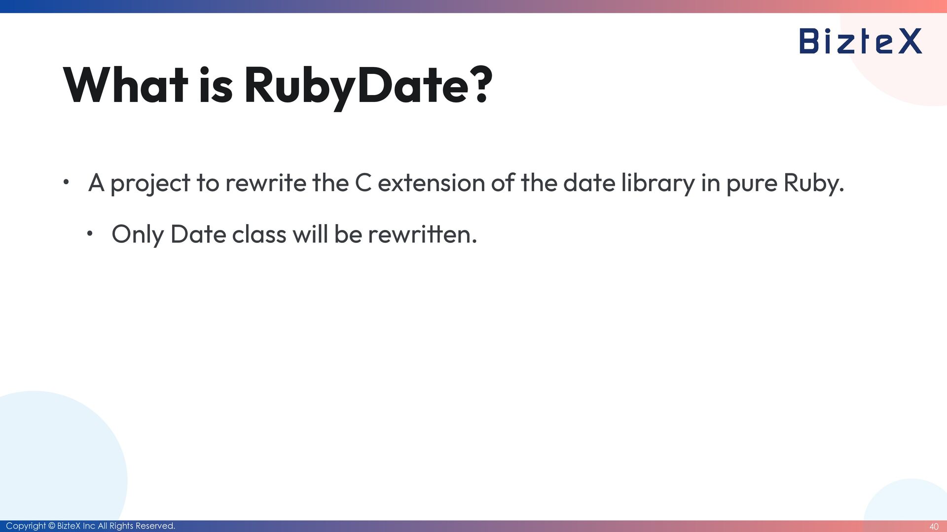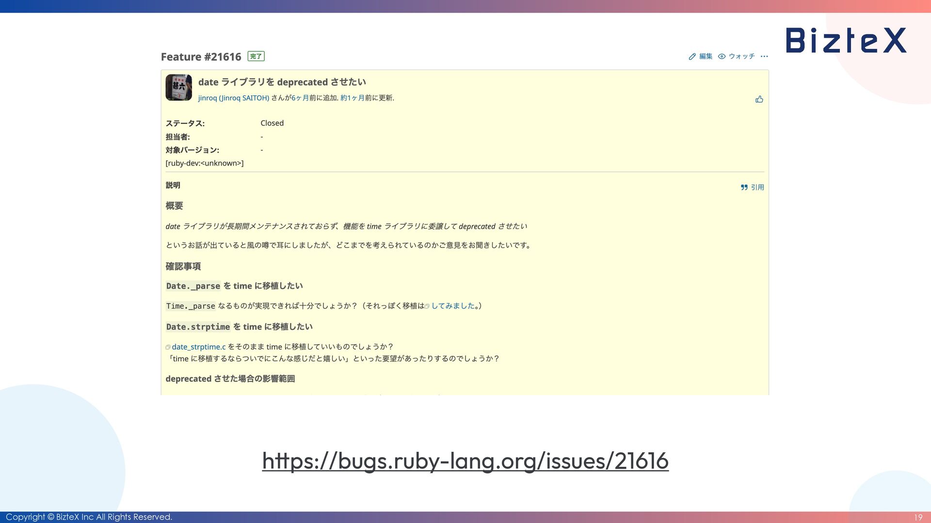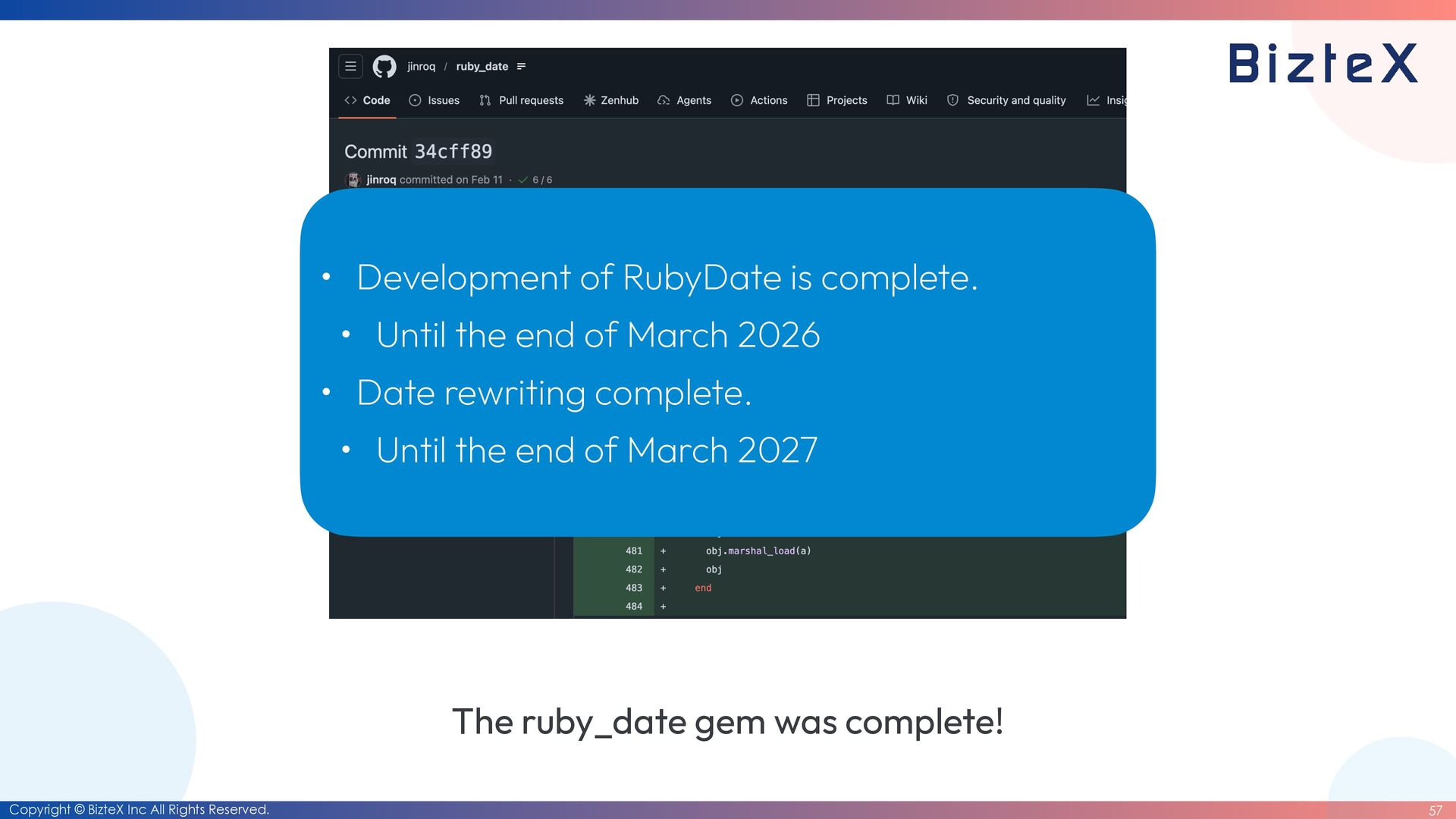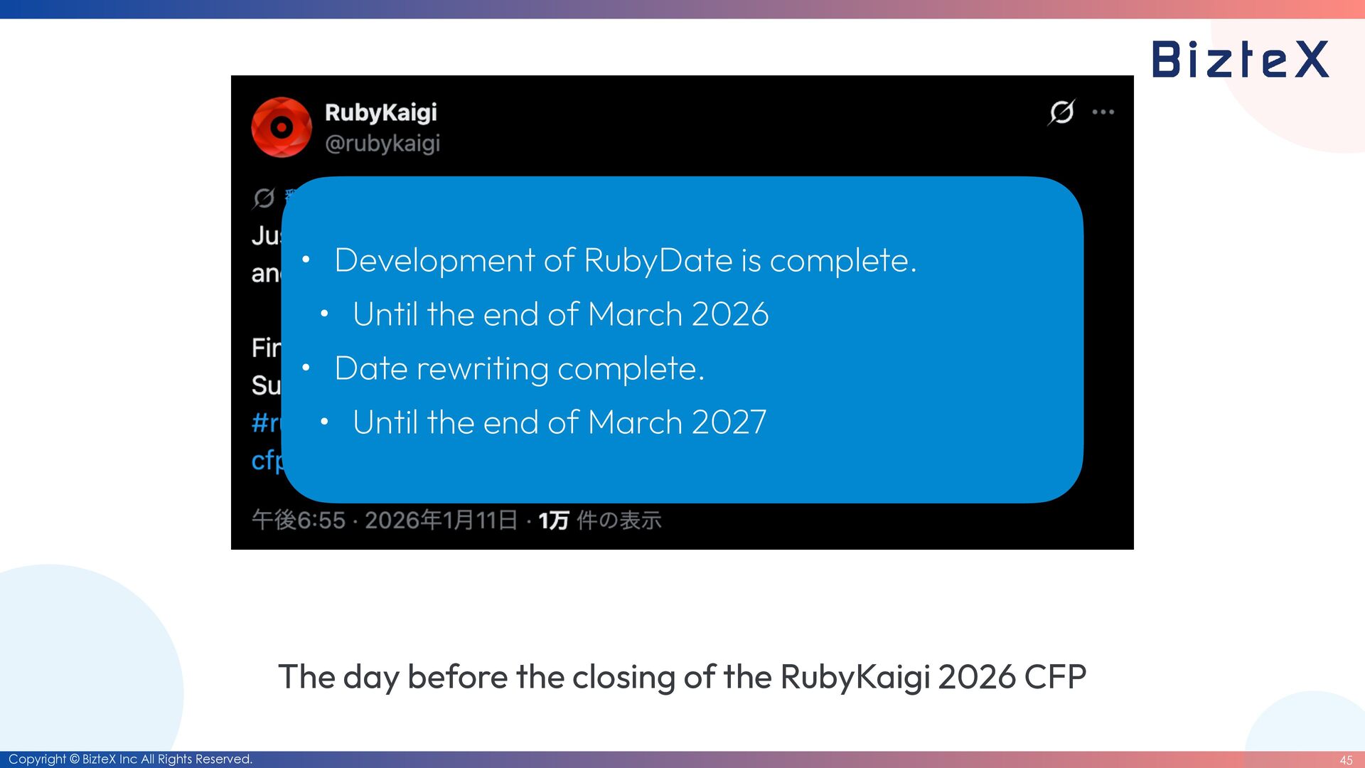 before the closing of the RubyKaigi 2026 CFP • Development of RubyDate is complete. • Until the end of March 2026 • Date rewriting complete. • Until the end of March 2027