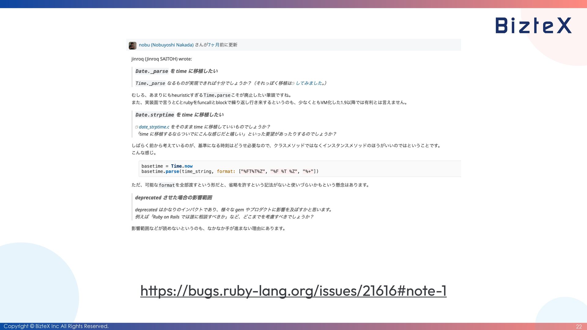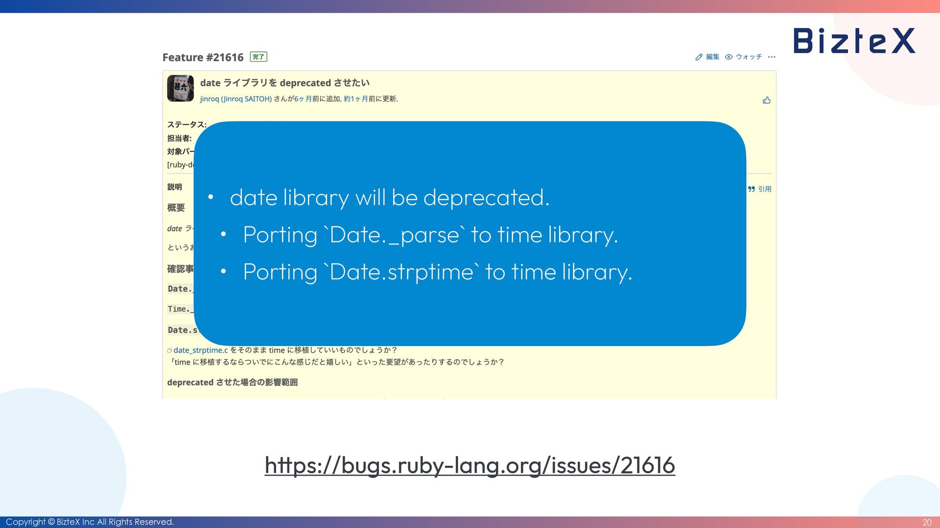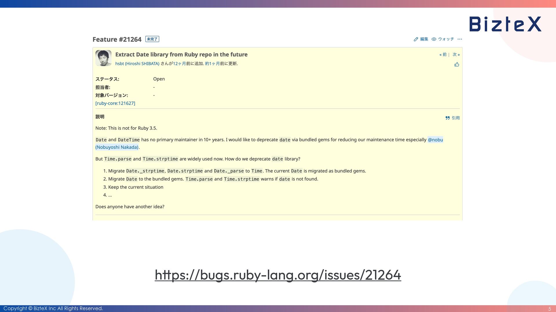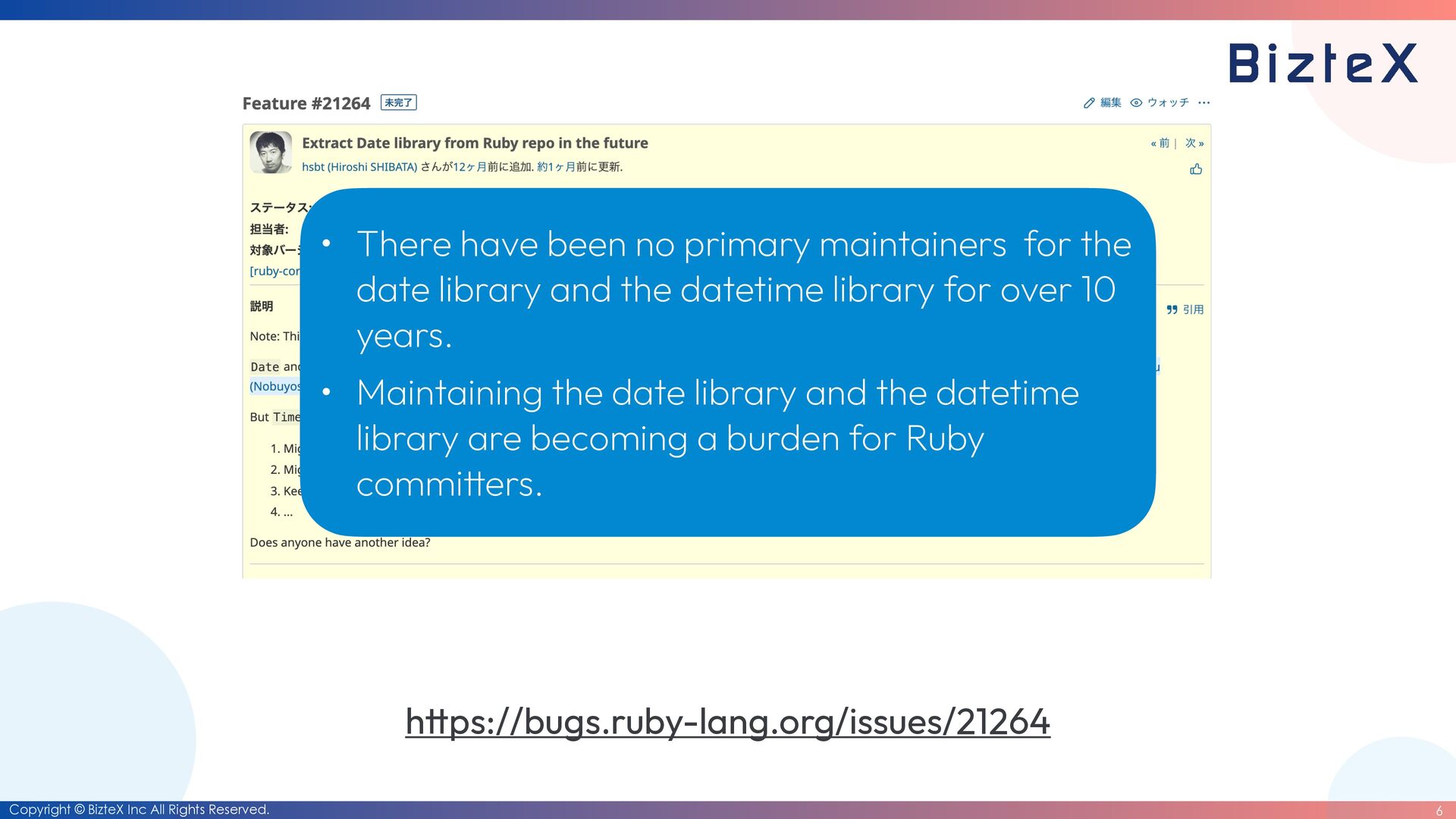 ps://bugs.ruby-lang.org/issues/21264 • There have been no primary maintainers for the date library and the datetime library for over 10 years. • Maintaining the date library and the datetime library are becoming a burden for Ruby commi tt ers.