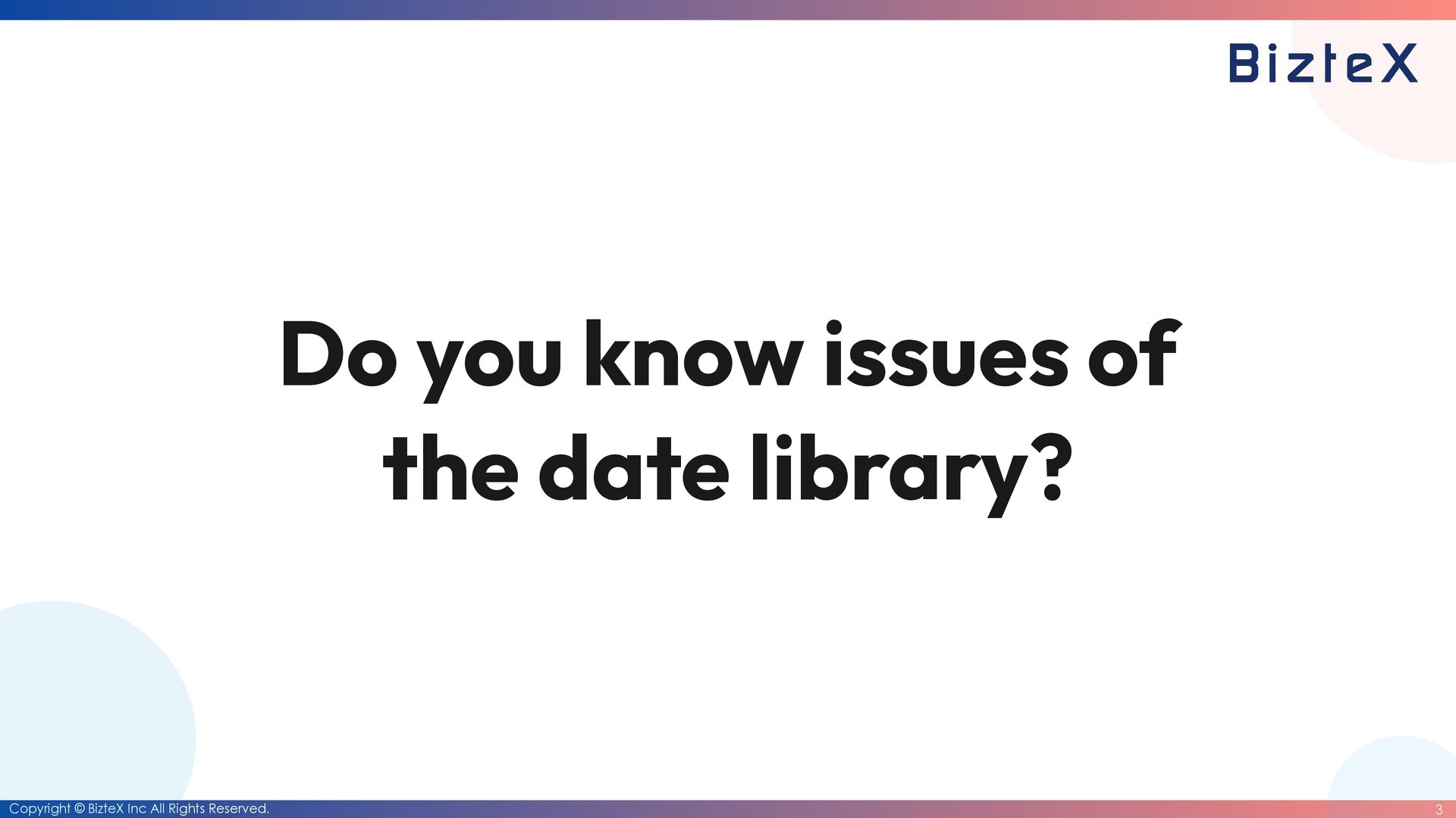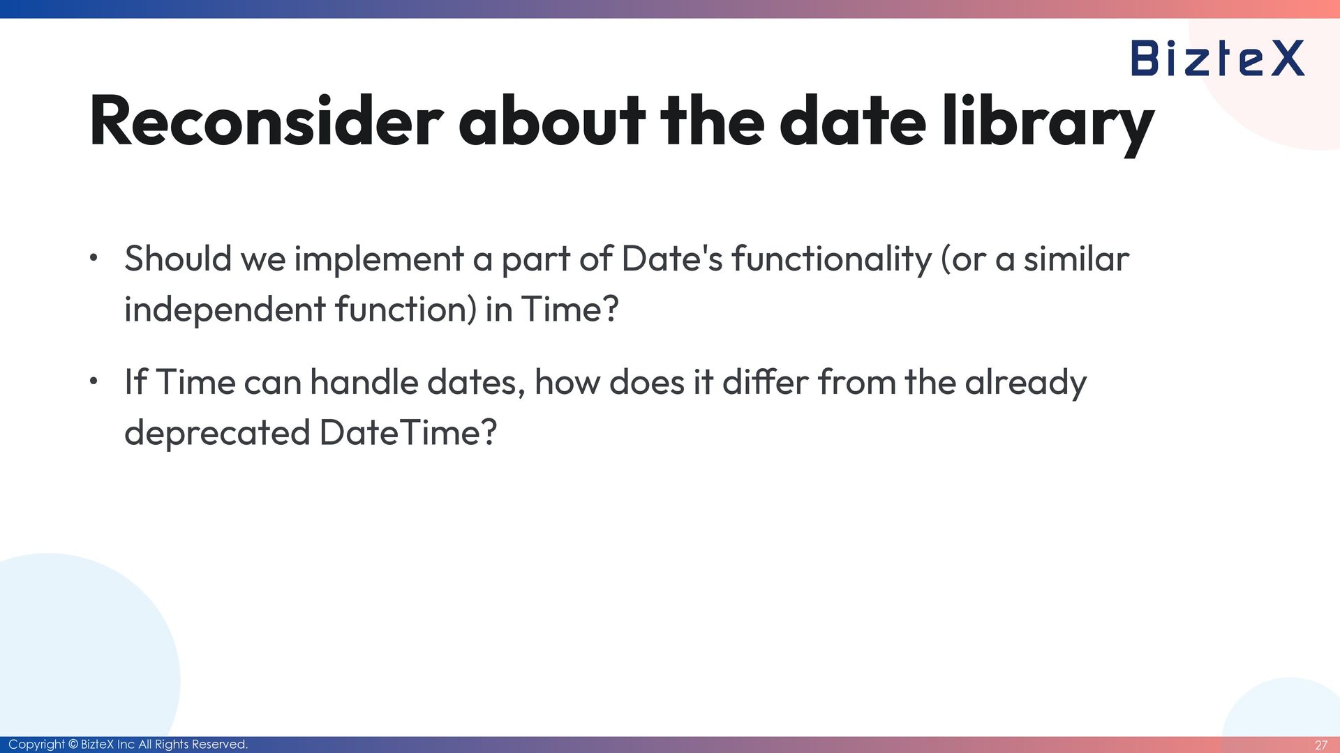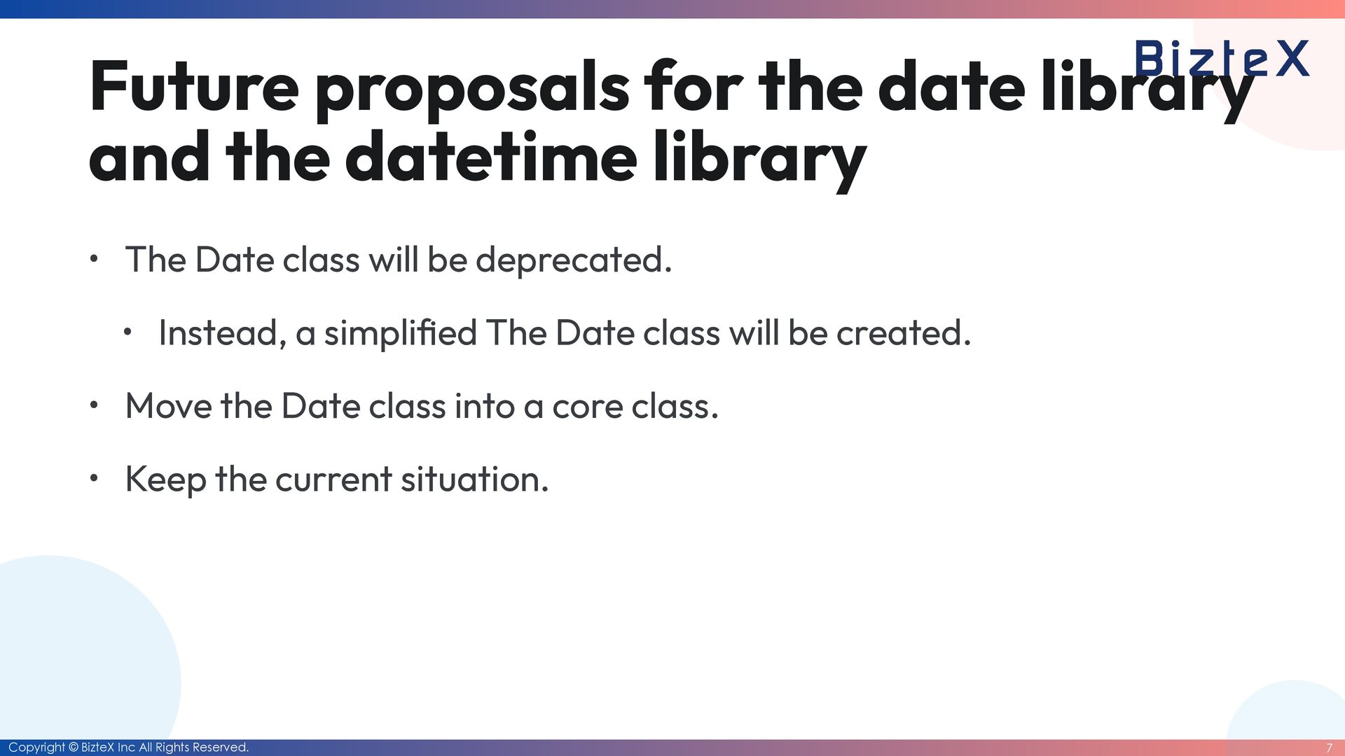 for the date library and the datetime library • The Date class will be deprecated. • Instead, a simpli fi ed The Date class will be created. • Move the Date class into a core class. • Keep the current situation.