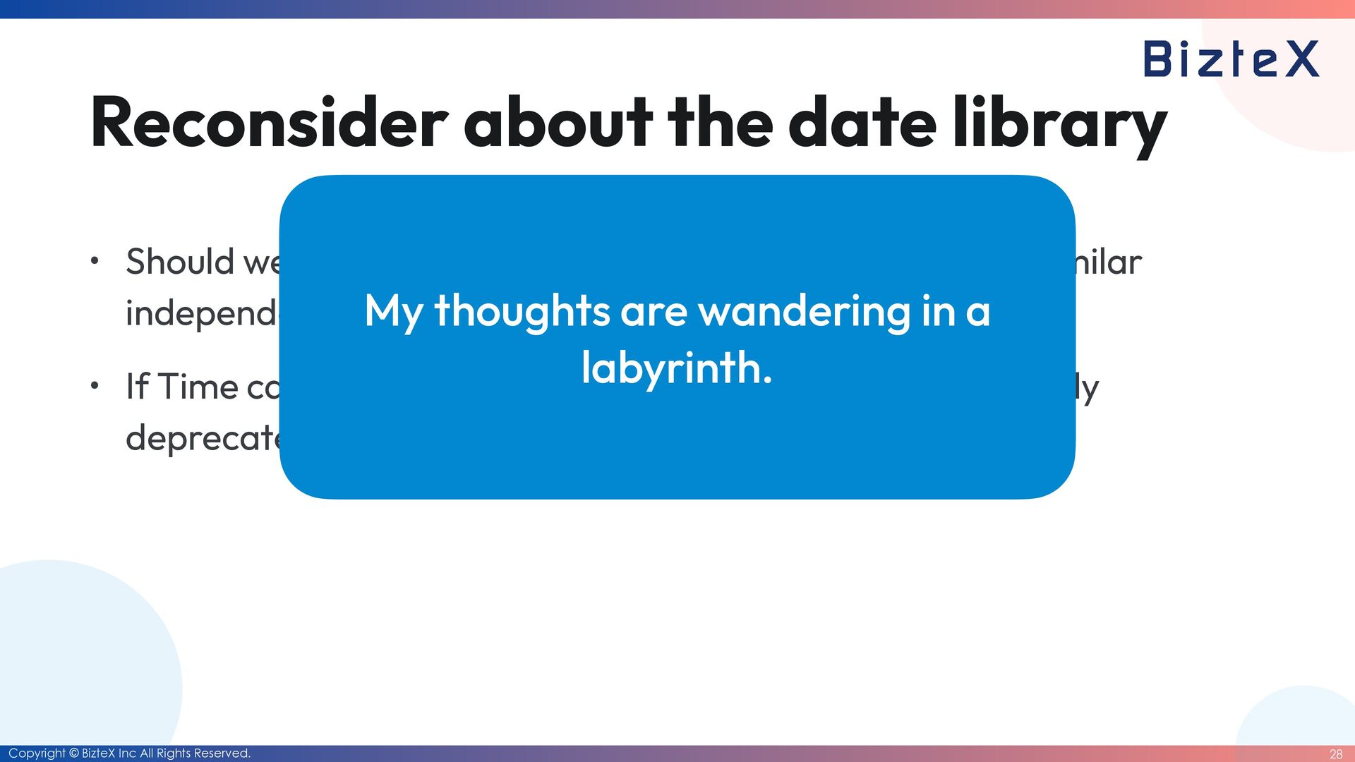 the date library • Should we implement a part of Date's functionality (or a similar independent function) in Time? • If Time can handle dates, how does it di ff er from the already deprecated DateTime? My thoughts are wandering in a labyrinth.