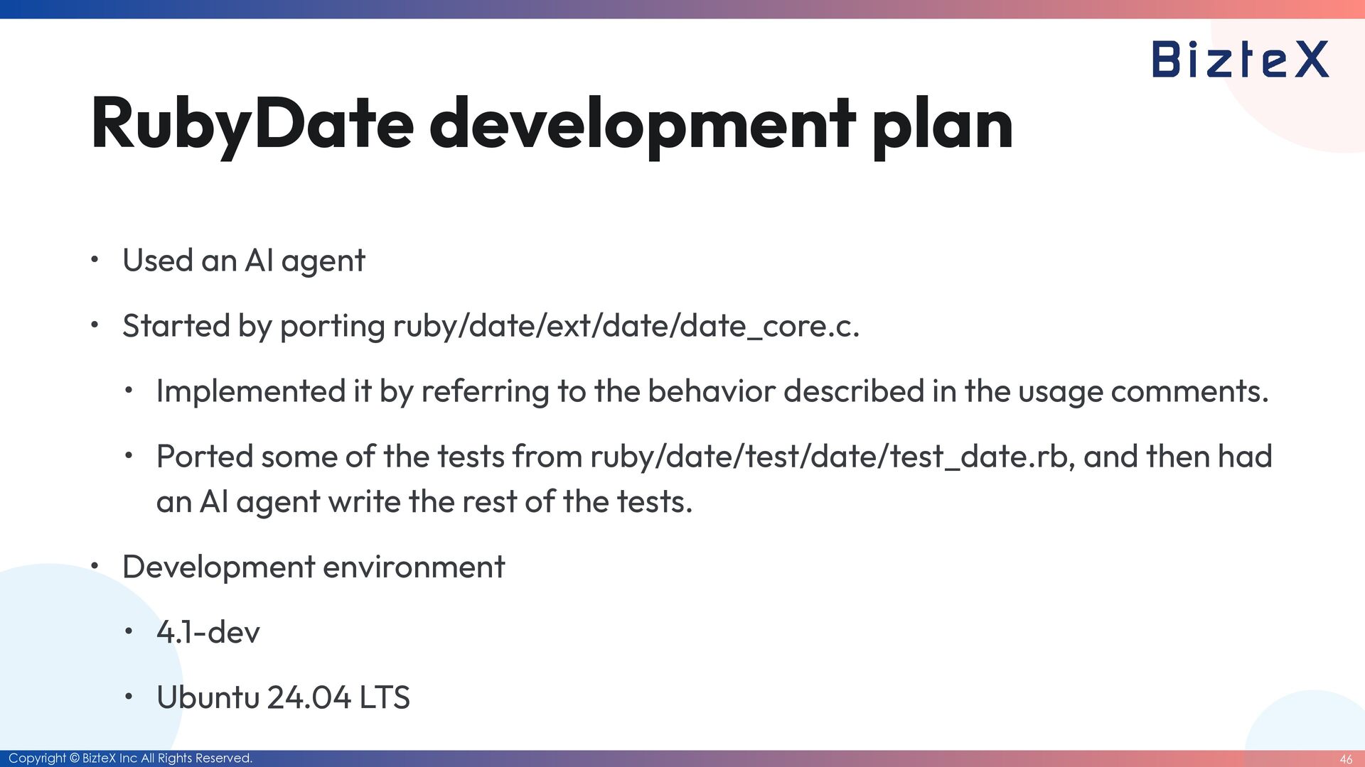 plan • Used an AI agent • Started by porting ruby/date/ext/date/date_core.c. • Implemented it by referring to the behavior described in the usage comments. • Ported some of the tests from ruby/date/test/date/test_date.rb, and then had an AI agent write the rest of the tests. • Development environment • 4.1-dev • Ubuntu 24.04 LTS