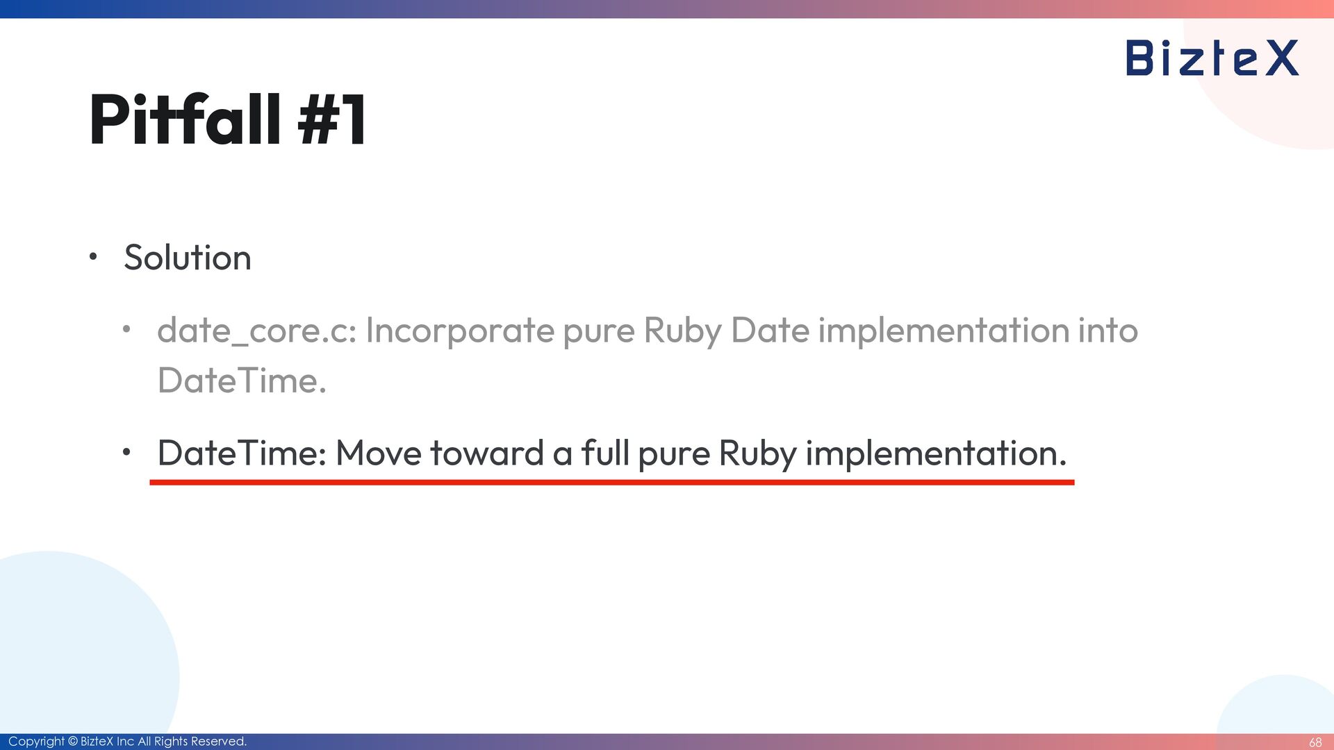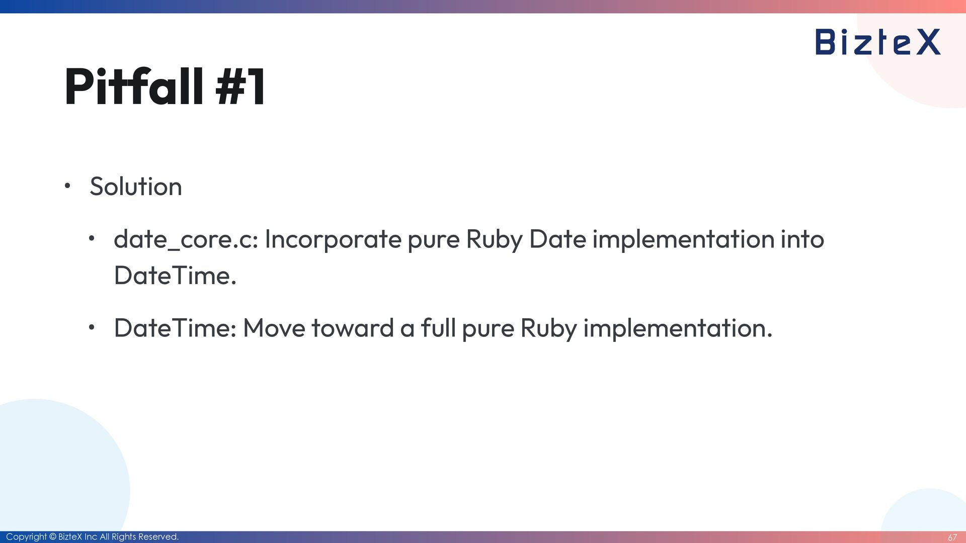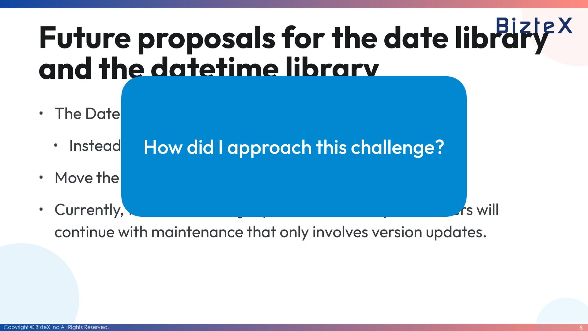for the date library and the datetime library • The Date class will be deprecated. • Instead, a simpli fi ed The Date class will be created. • Move the Date class into a core class. • Currently, there are no major problems, so Ruby commi tt ers will continue with maintenance that only involves version updates. How did I approach this challenge?