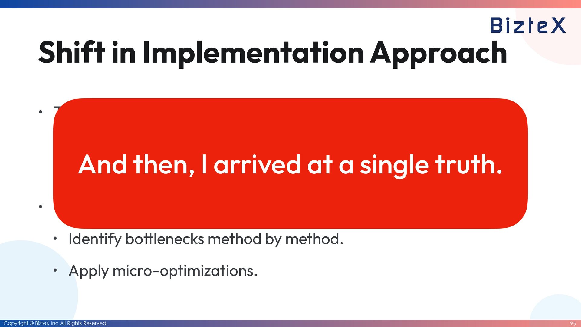 Implementation Approach • The Rules for AI agent: • Zero changes to tests. (Maintain the ground truth) • Target: 85%+ performance of C extension. • The Process: • Identify bo tt lenecks method by method. • Apply micro-optimizations. And then, I arrived at a single truth.