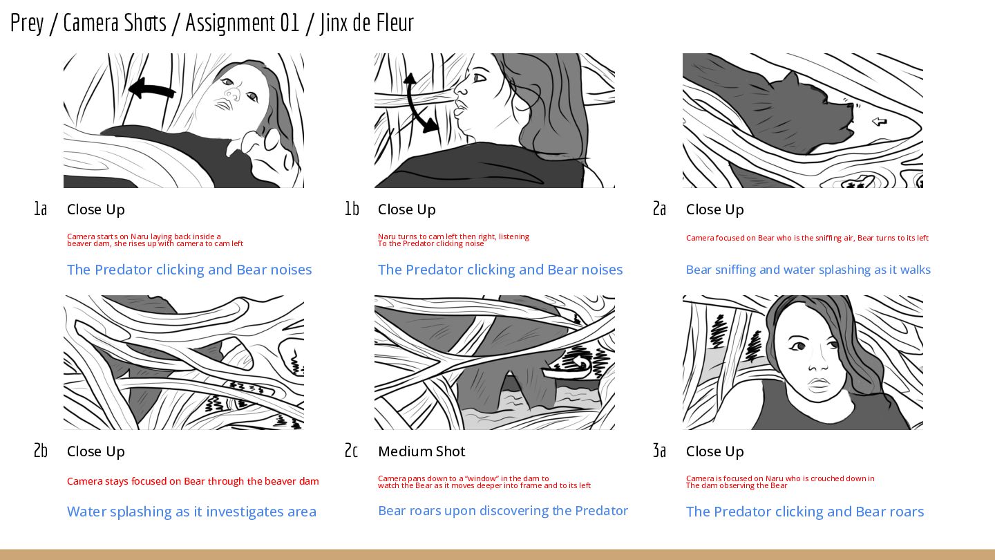 Fleur 1a Close Up Camera starts on Naru laying back inside a beaver dam, she rises up with camera to cam left The Predator clicking and Bear noises 1b Close Up Naru turns to cam left then right, listening To the Predator clicking noise The Predator clicking and Bear noises 2a Close Up Camera focused on Bear who is the sniffing air, Bear turns to its left Bear sniffing and water splashing as it walks 2b Close Up Camera stays focused on Bear through the beaver dam Water splashing as it investigates area 2c Medium Shot Camera pans down to a “window” in the dam to watch the Bear as it moves deeper into frame and to its left Bear roars upon discovering the Predator 3a Close Up Camera is focused on Naru who is crouched down in The dam observing the Bear The Predator clicking and Bear roars