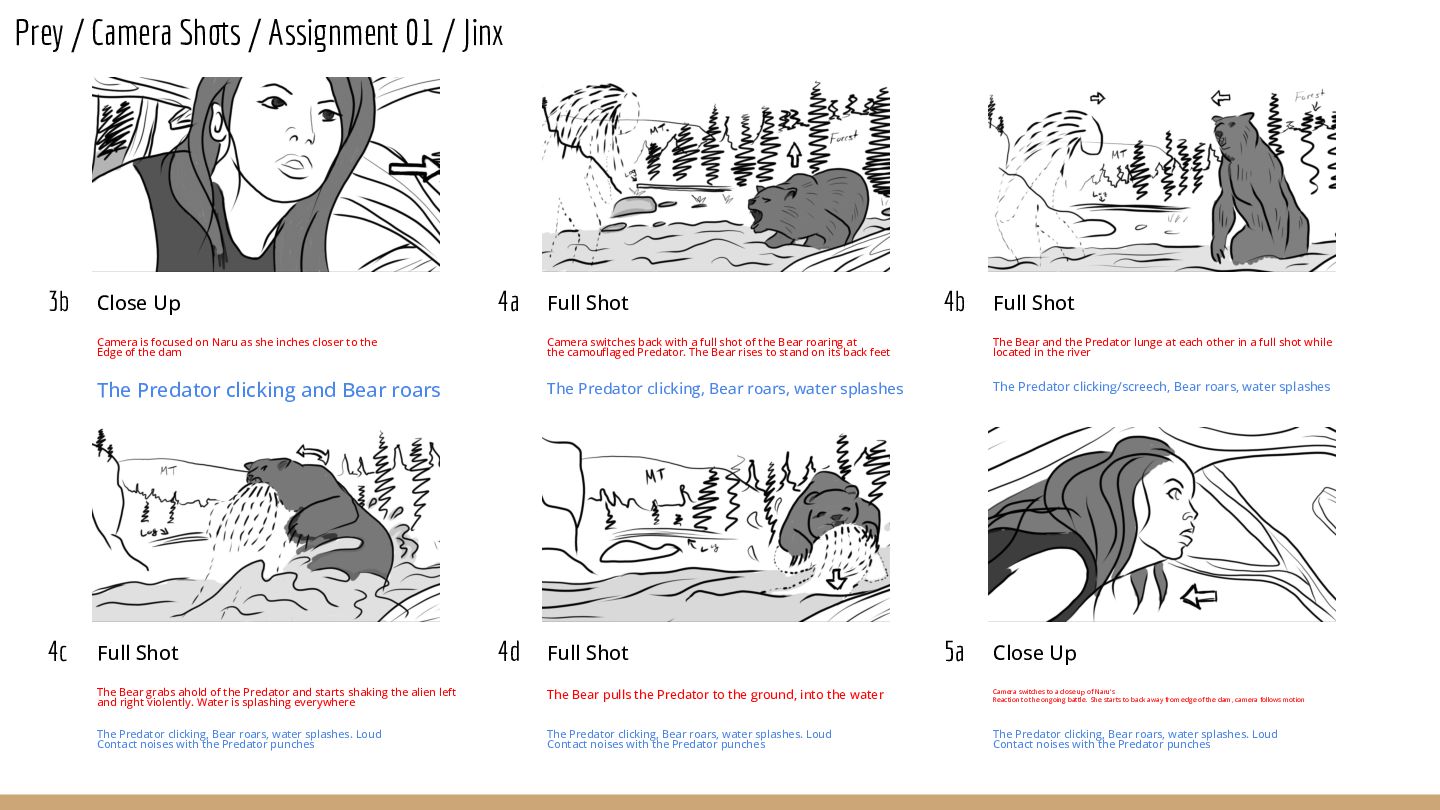 Close Up Camera is focused on Naru as she inches closer to the Edge of the dam The Predator clicking and Bear roars 4a Full Shot Camera switches back with a full shot of the Bear roaring at the camouflaged Predator. The Bear rises to stand on its back feet The Predator clicking, Bear roars, water splashes 4b Full Shot The Bear and the Predator lunge at each other in a full shot while located in the river The Predator clicking/screech, Bear roars, water splashes 4c Full Shot The Bear grabs ahold of the Predator and starts shaking the alien left and right violently. Water is splashing everywhere The Predator clicking, Bear roars, water splashes. Loud Contact noises with the Predator punches 4d Full Shot The Bear pulls the Predator to the ground, into the water The Predator clicking, Bear roars, water splashes. Loud Contact noises with the Predator punches 5a Close Up Camera switches to a close up of Naru’s Reaction to the ongoing battle. She starts to back away from edge of the dam, camera follows motion The Predator clicking, Bear roars, water splashes. Loud Contact noises with the Predator punches