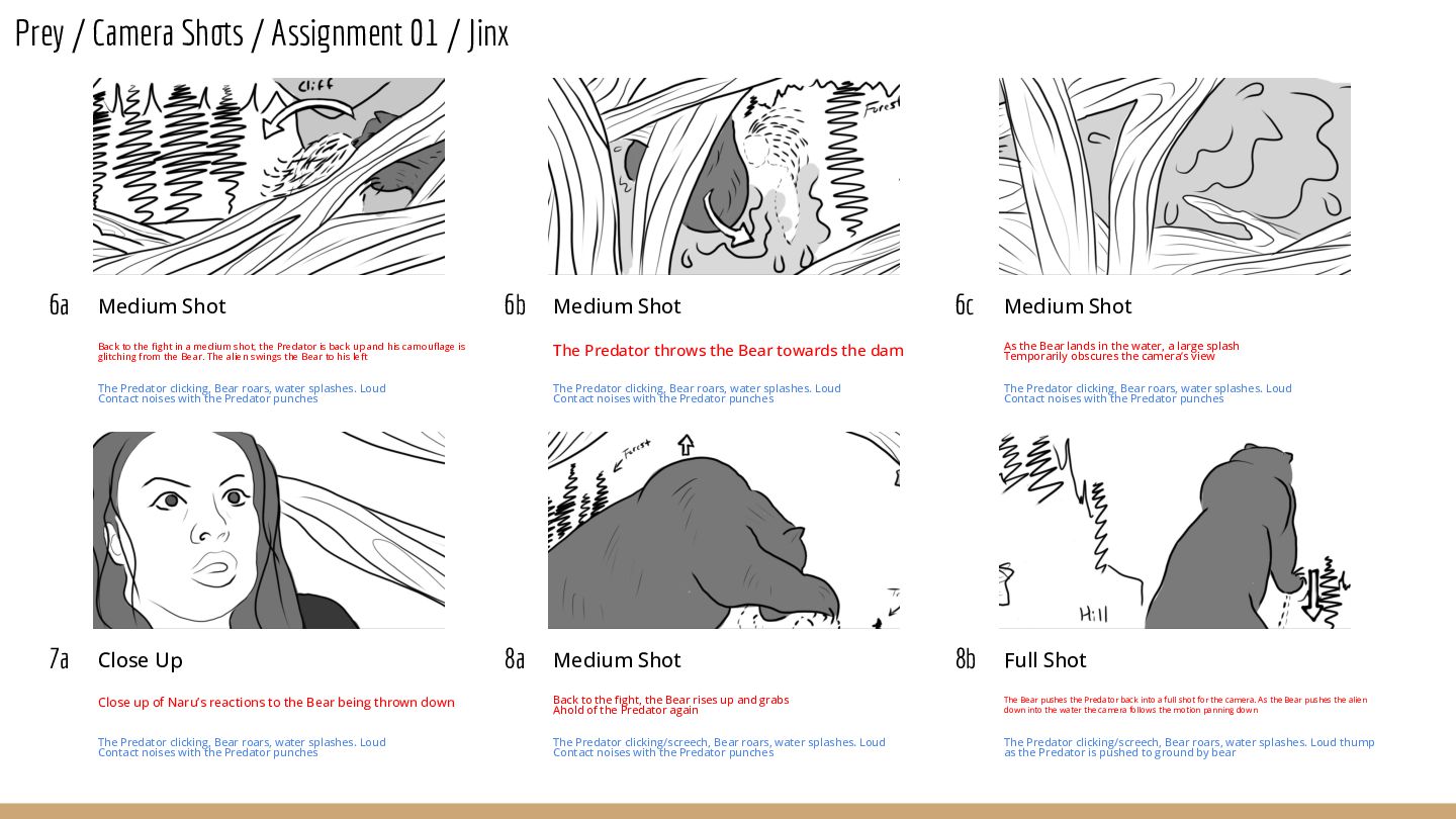 Medium Shot Back to the fight in a medium shot, the Predator is back up and his camouflage is glitching from the Bear. The alien swings the Bear to his left The Predator clicking, Bear roars, water splashes. Loud Contact noises with the Predator punches 6b Medium Shot The Predator throws the Bear towards the dam The Predator clicking, Bear roars, water splashes. Loud Contact noises with the Predator punches 6c Medium Shot As the Bear lands in the water, a large splash Temporarily obscures the camera’s view The Predator clicking, Bear roars, water splashes. Loud Contact noises with the Predator punches 7a Close Up Close up of Naru’s reactions to the Bear being thrown down The Predator clicking, Bear roars, water splashes. Loud Contact noises with the Predator punches 8a Medium Shot Back to the fight, the Bear rises up and grabs Ahold of the Predator again The Predator clicking/screech, Bear roars, water splashes. Loud Contact noises with the Predator punches 8b Full Shot The Bear pushes the Predator back into a full shot for the camera. As the Bear pushes the alien down into the water the camera follows the motion panning down The Predator clicking/screech, Bear roars, water splashes. Loud thump as the Predator is pushed to ground by bear