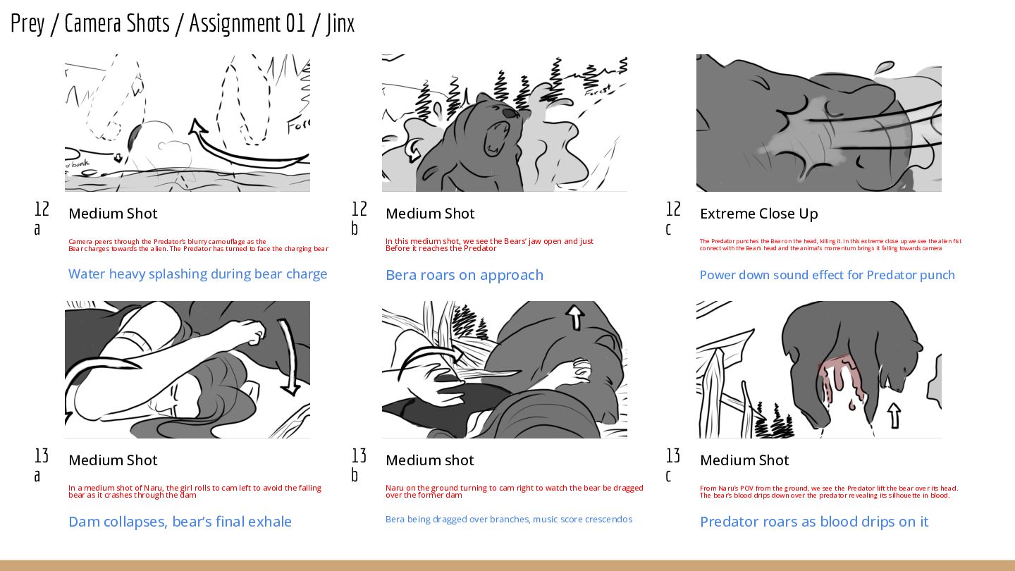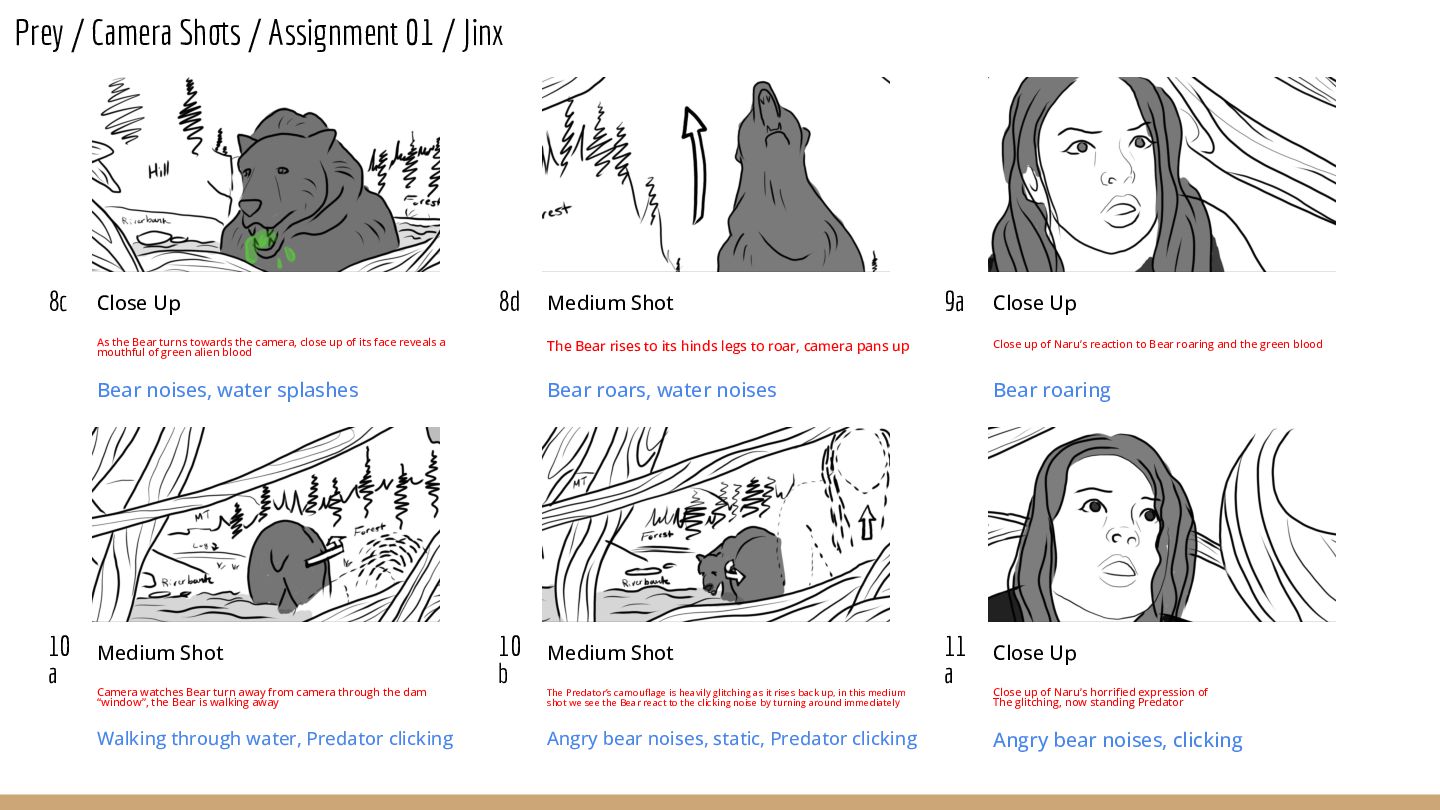 Close Up As the Bear turns towards the camera, close up of its face reveals a mouthful of green alien blood Bear noises, water splashes 8d Medium Shot The Bear rises to its hinds legs to roar, camera pans up Bear roars, water noises 9a Close Up Close up of Naru’s reaction to Bear roaring and the green blood Bear roaring 10 a Medium Shot Camera watches Bear turn away from camera through the dam “window”, the Bear is walking away Walking through water, Predator clicking 10 b Medium Shot The Predator’s camouflage is heavily glitching as it rises back up, in this medium shot we see the Bear react to the clicking noise by turning around immediately Angry bear noises, static, Predator clicking 11 a Close Up Close up of Naru’s horrified expression of The glitching, now standing Predator Angry bear noises, clicking
