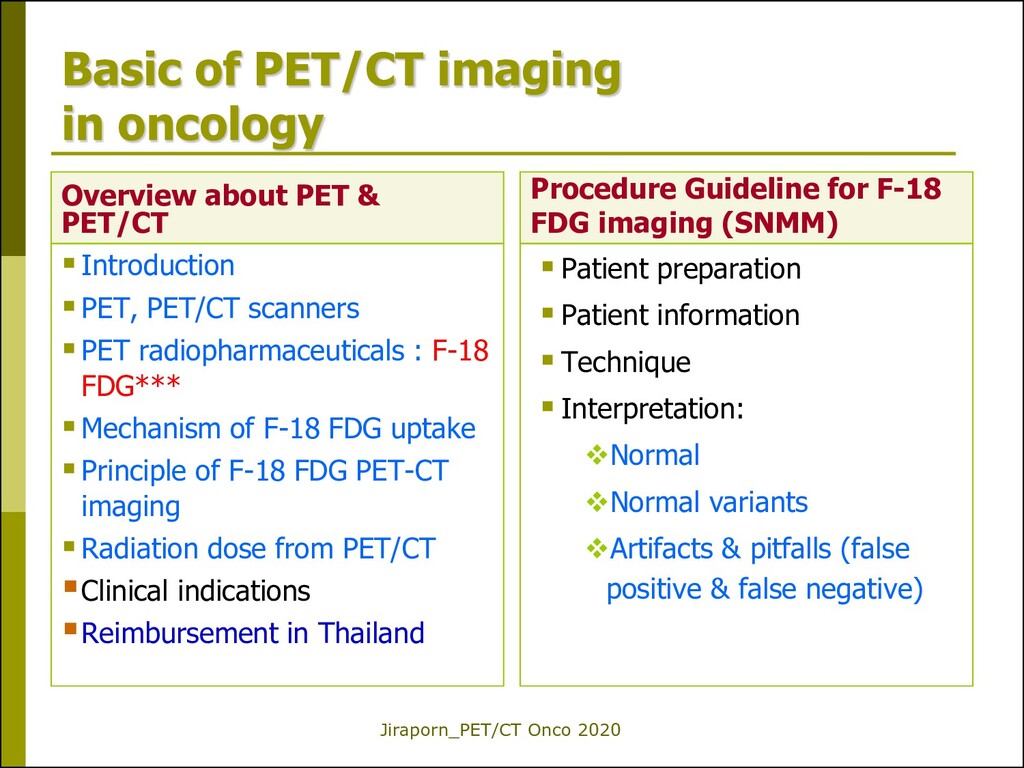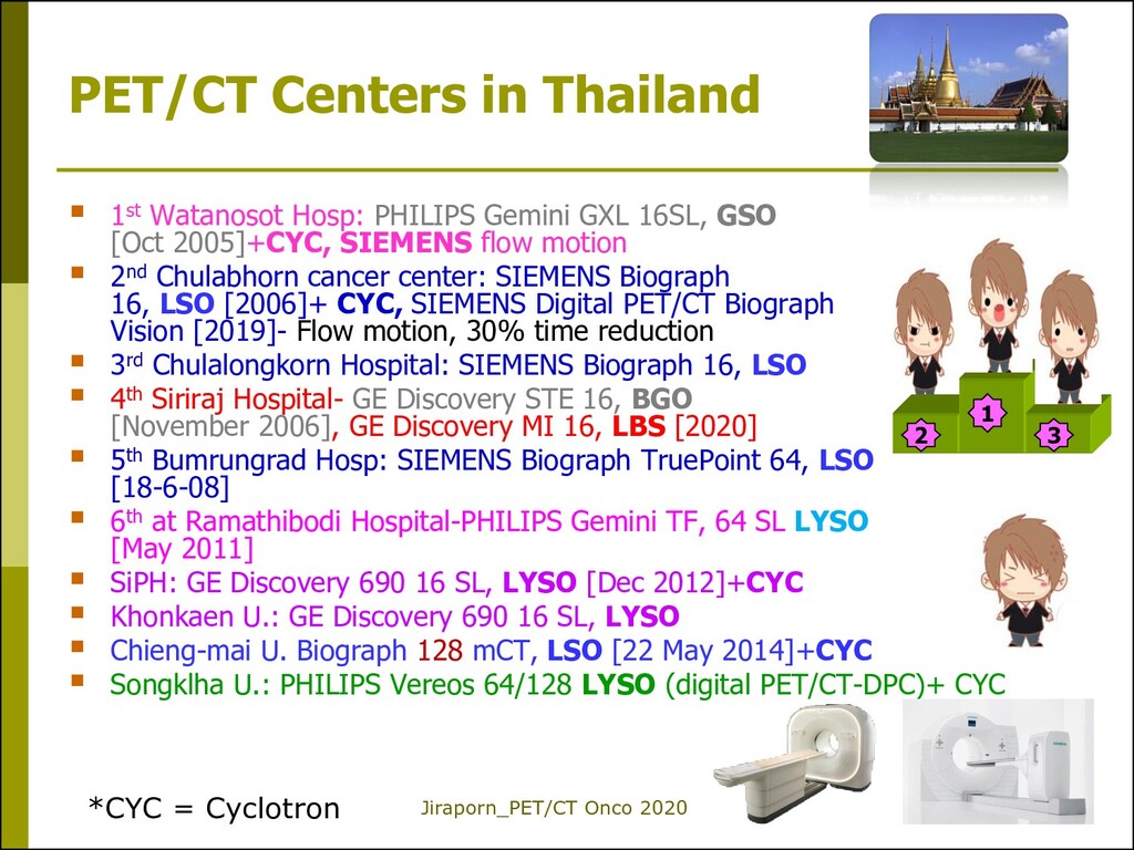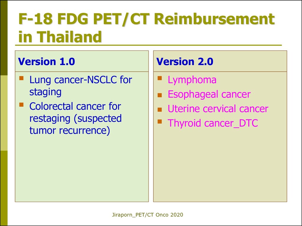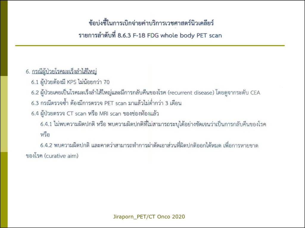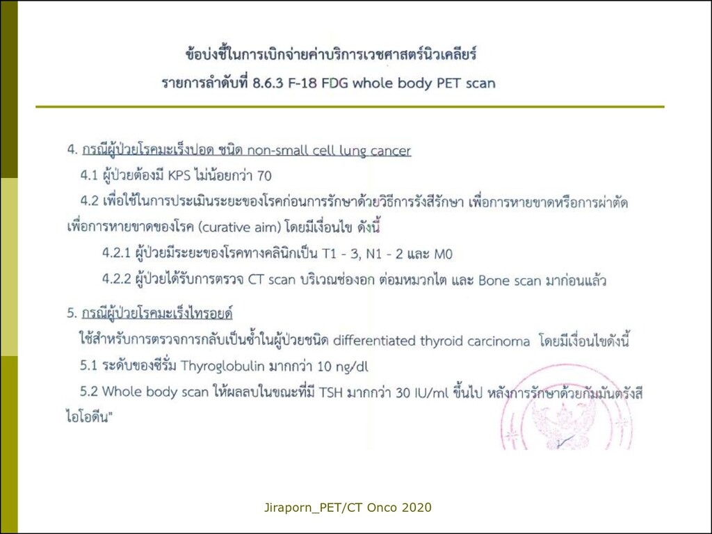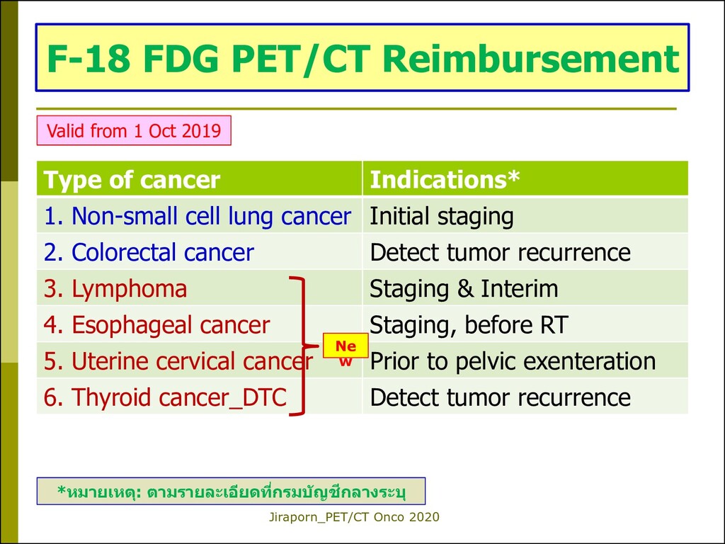lung cancer Initial staging 2. Colorectal cancer Detect tumor recurrence 3. Lymphoma Staging & Interim 4. Esophageal cancer Staging, before RT 5. Uterine cervical cancer Prior to pelvic exenteration 6. Thyroid cancer_DTC Detect tumor recurrence Ne w F-18 FDG PET/CT Reimbursement Valid from 1 Oct 2019 *หมายเหตุ: ตามรายละเอียดที่กรมบัญชีกลางระบุ