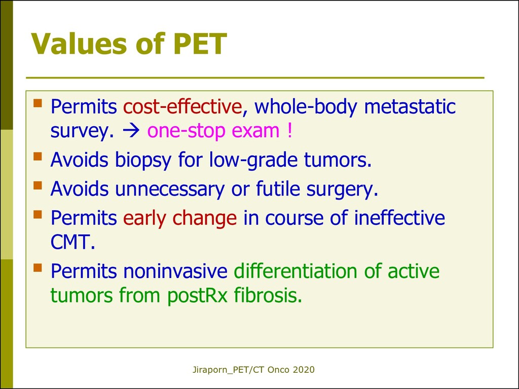metastatic survey. one-stop exam ! Avoids biopsy for low-grade tumors. Avoids unnecessary or futile surgery. Permits early change in course of ineffective CMT. Permits noninvasive differentiation of active tumors from postRx fibrosis.