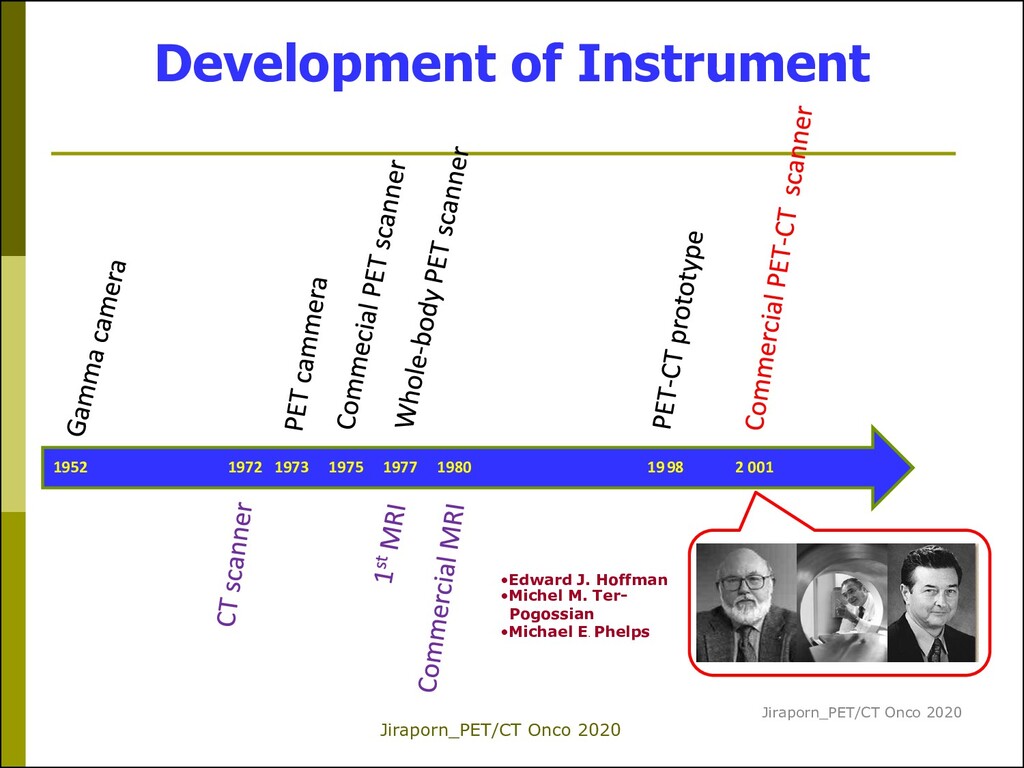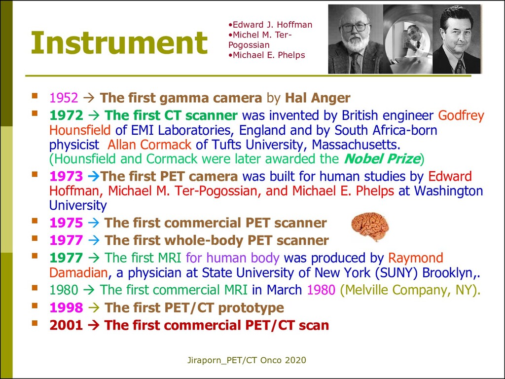 camera by Hal Anger 1972 The first CT scanner was invented by British engineer Godfrey Hounsfield of EMI Laboratories, England and by South Africa-born physicist Allan Cormack of Tufts University, Massachusetts. (Hounsfield and Cormack were later awarded the Nobel Prize) 1973 The first PET camera was built for human studies by Edward Hoffman, Michael M. Ter-Pogossian, and Michael E. Phelps at Washington University 1975 The first commercial PET scanner 1977 The first whole-body PET scanner 1977 The first MRI for human body was produced by Raymond Damadian, a physician at State University of New York (SUNY) Brooklyn,. 1980 The first commercial MRI in March 1980 (Melville Company, NY). 1998 The first PET/CT prototype 2001 The first commercial PET/CT scan •Edward J. Hoffman •Michel M. Ter- Pogossian •Michael E. Phelps