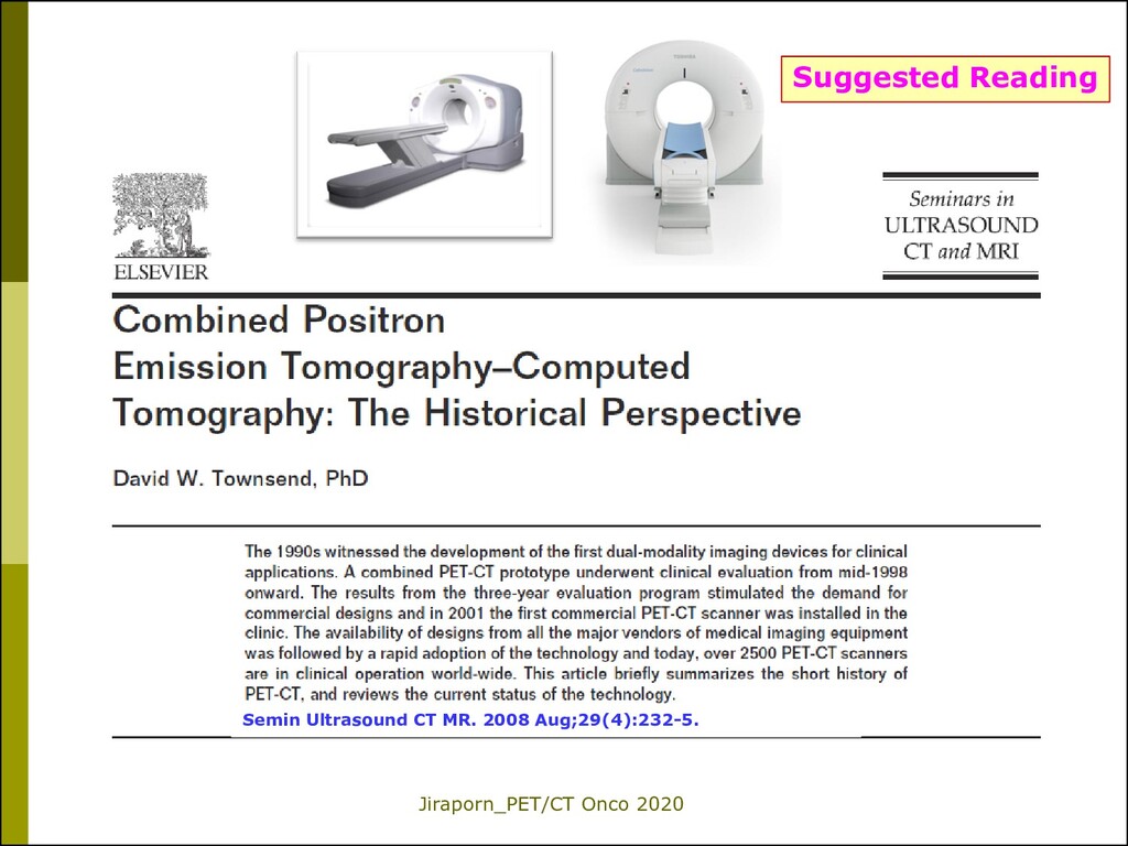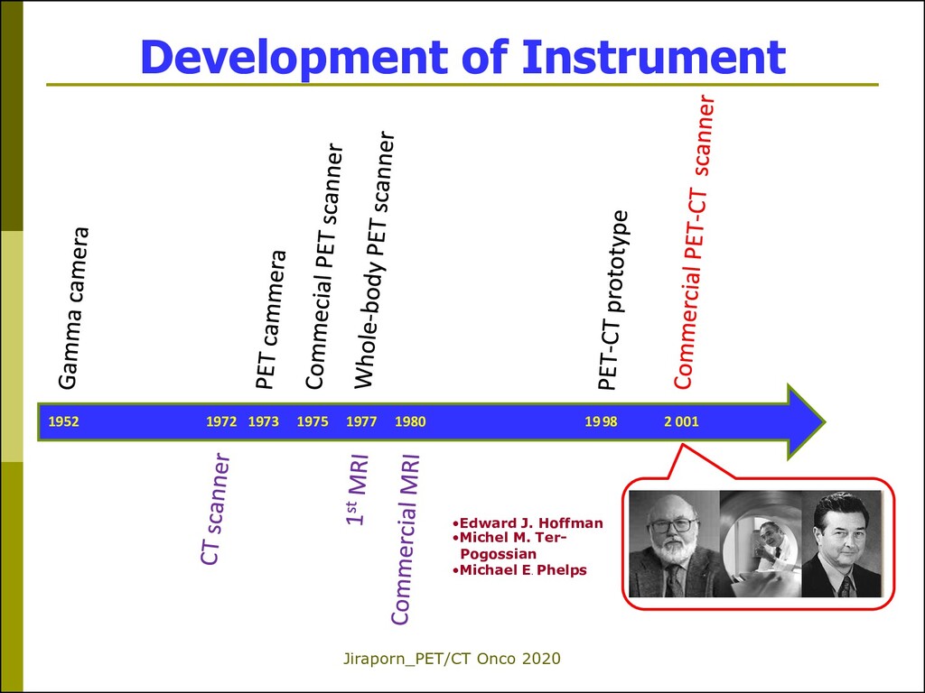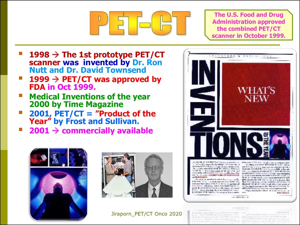 scanner was invented by Dr. Ron Nutt and Dr. David Townsend 1999 PET/CT was approved by FDA in Oct 1999. Medical Inventions of the year 2000 by Time Magazine 2001, PET/CT = ”Product of the Year” by Frost and Sullivan. 2001 commercially available The U.S. Food and Drug Administration approved the combined PET/CT scanner in October 1999.