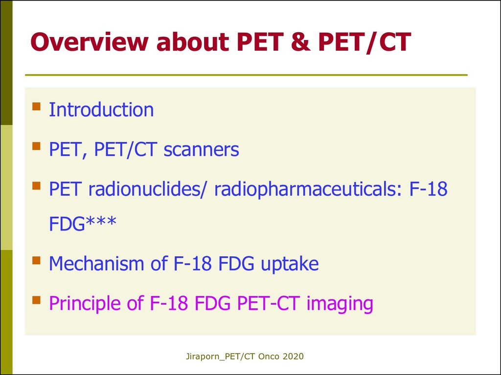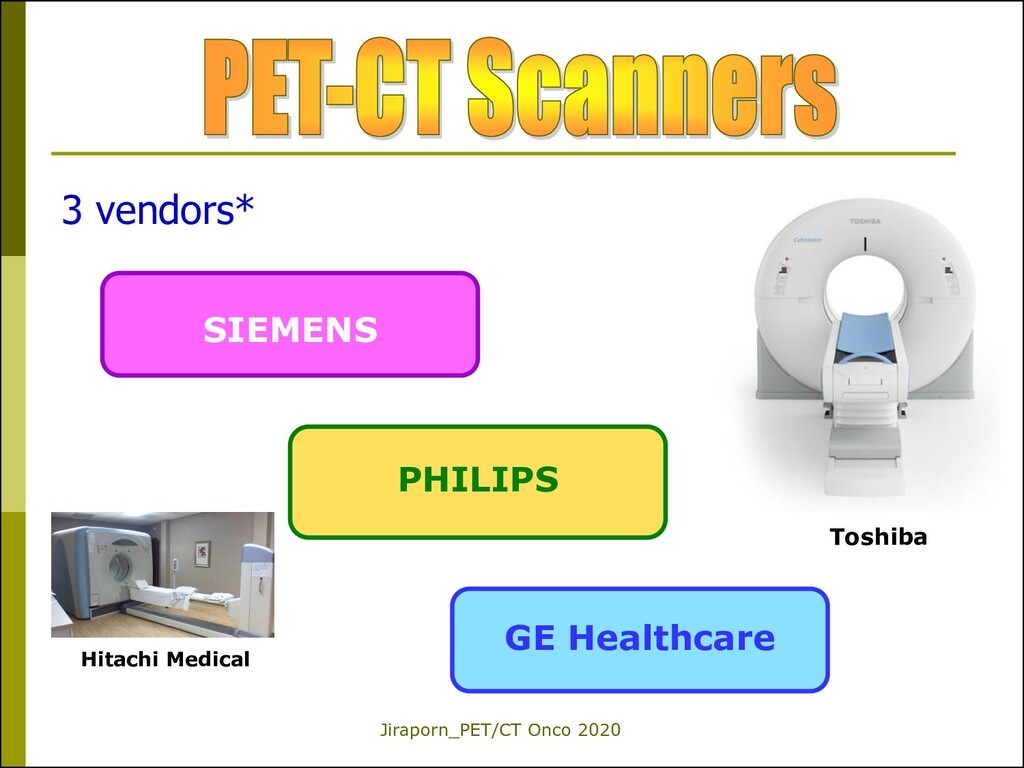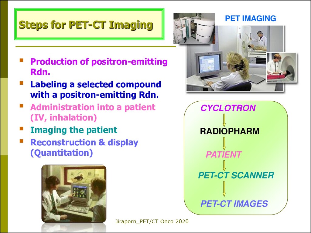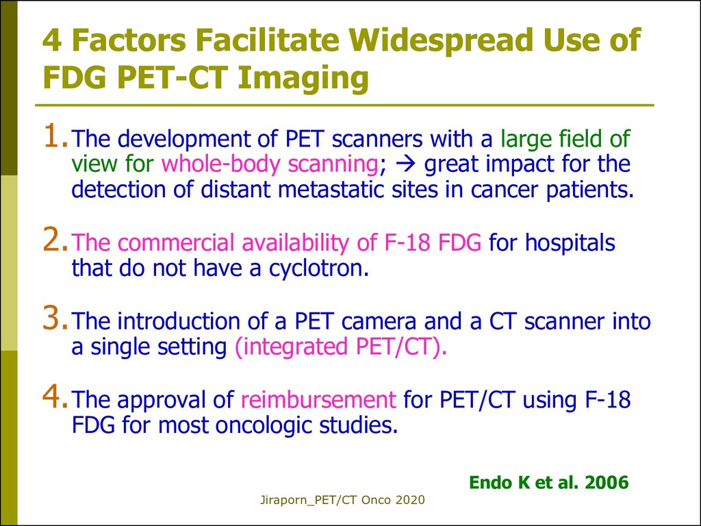 PET-CT Imaging 1.The development of PET scanners with a large field of view for whole-body scanning; great impact for the detection of distant metastatic sites in cancer patients. 2.The commercial availability of F-18 FDG for hospitals that do not have a cyclotron. 3.The introduction of a PET camera and a CT scanner into a single setting (integrated PET/CT). 4.The approval of reimbursement for PET/CT using F-18 FDG for most oncologic studies. Endo K et al. 2006