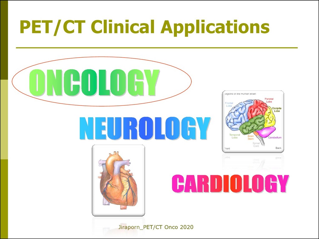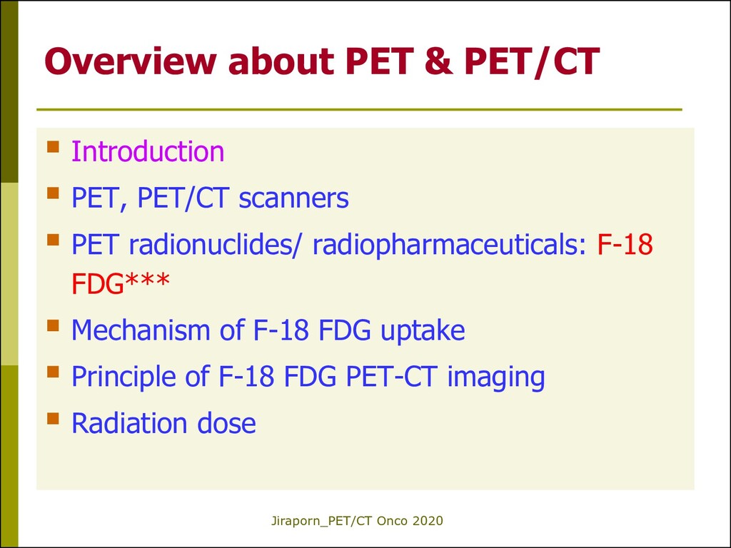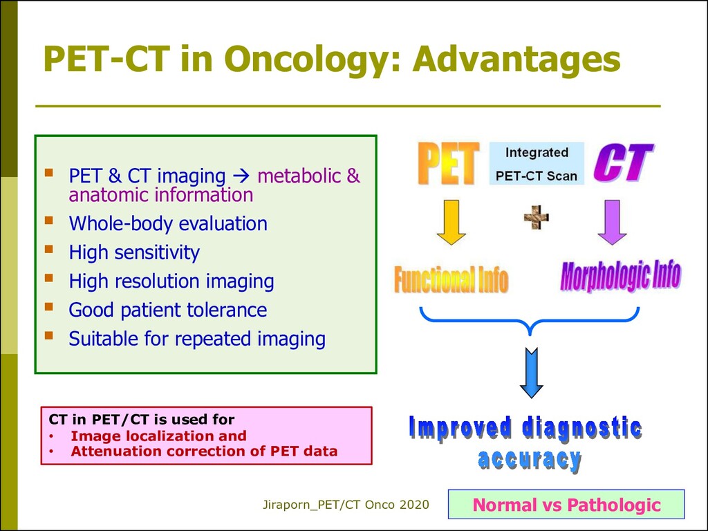CT imaging metabolic & anatomic information Whole-body evaluation High sensitivity High resolution imaging Good patient tolerance Suitable for repeated imaging Normal vs Pathologic CT in PET/CT is used for • Image localization and • Attenuation correction of PET data