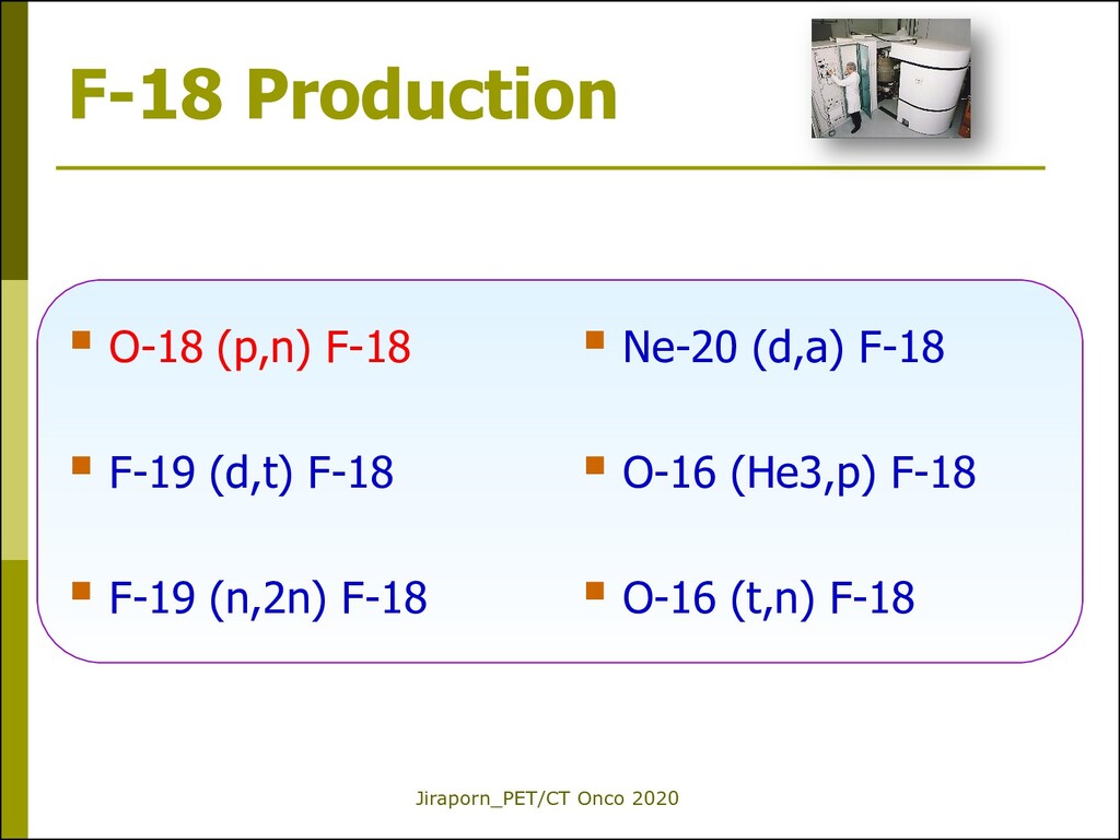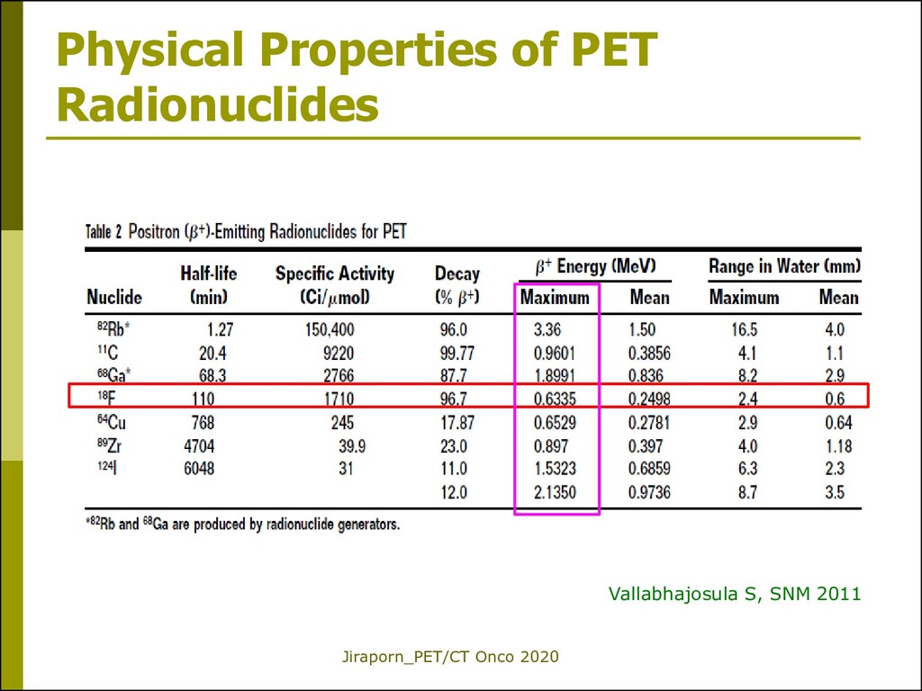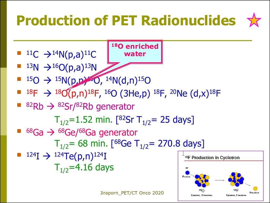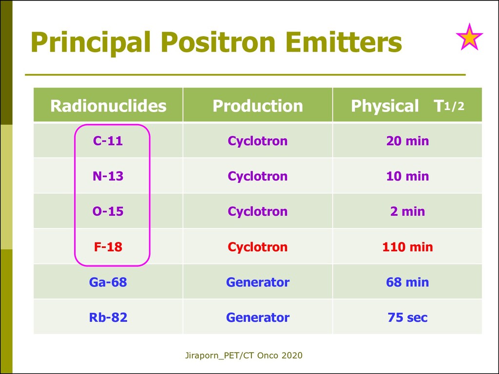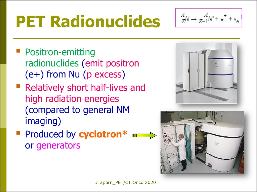 (e+) from Nu (p excess) Relatively short half-lives and high radiation energies (compared to general NM imaging) Produced by cyclotron* or generators