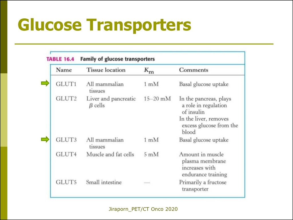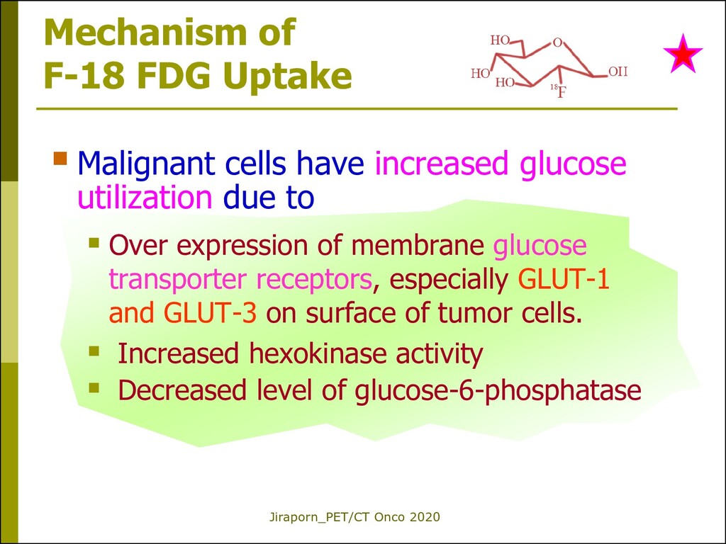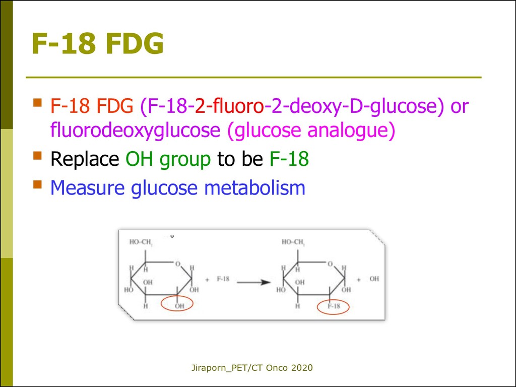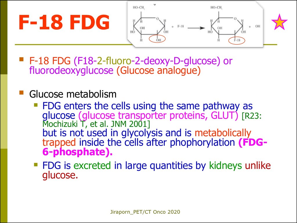 fluorodeoxyglucose (Glucose analogue) Glucose metabolism FDG enters the cells using the same pathway as glucose (glucose transporter proteins, GLUT) [R23: Mochizuki T, et al. JNM 2001] but is not used in glycolysis and is metabolically trapped inside the cells after phophorylation (FDG- 6-phosphate). FDG is excreted in large quantities by kidneys unlike glucose.