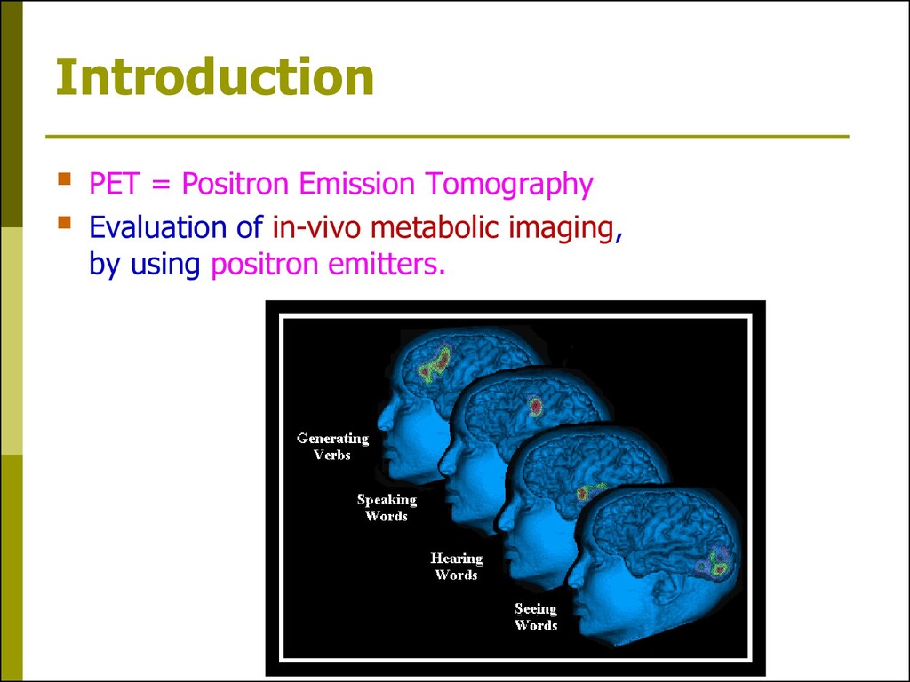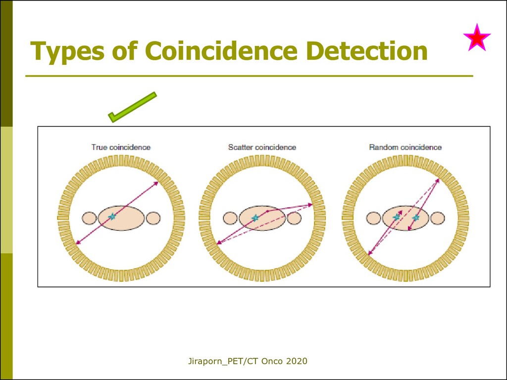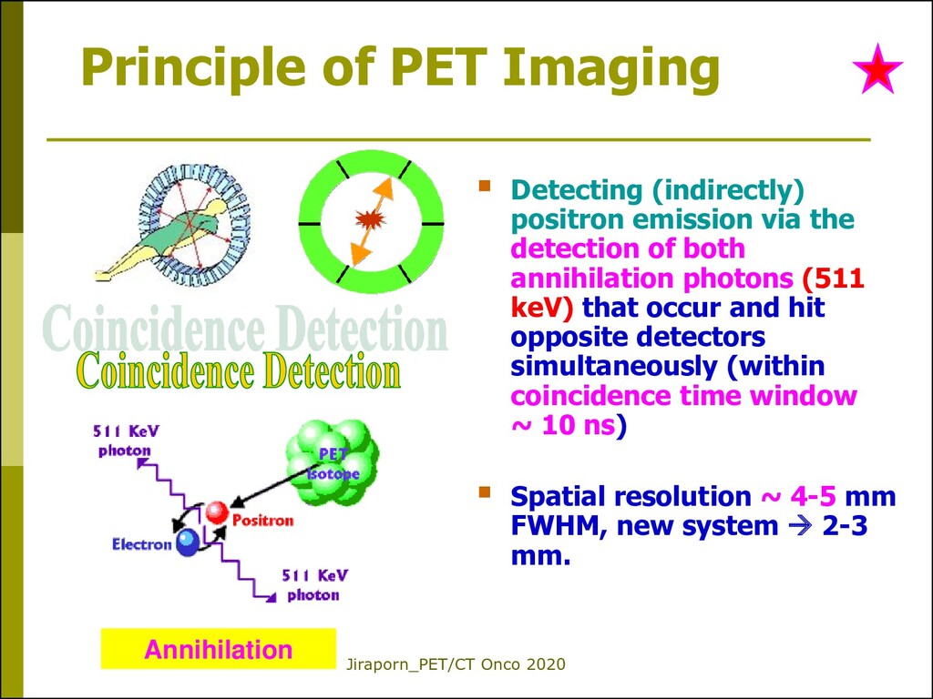 positron emission via the detection of both annihilation photons (511 keV) that occur and hit opposite detectors simultaneously (within coincidence time window ~ 10 ns) Spatial resolution ~ 4-5 mm FWHM, new system 2-3 mm. Annihilation