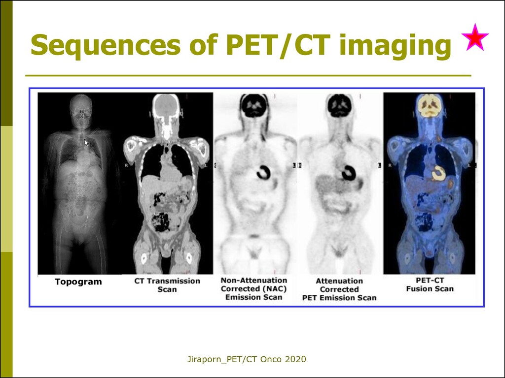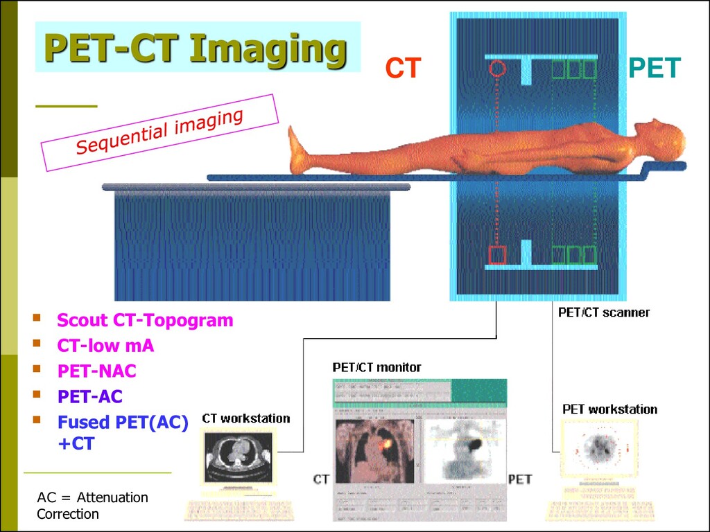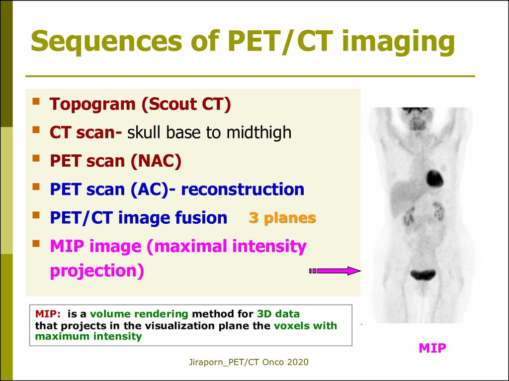 CT) CT scan- skull base to midthigh PET scan (NAC) PET scan (AC)- reconstruction PET/CT image fusion MIP image (maximal intensity projection) 3 planes MIP: is a volume rendering method for 3D data that projects in the visualization plane the voxels with maximum intensity MIP
