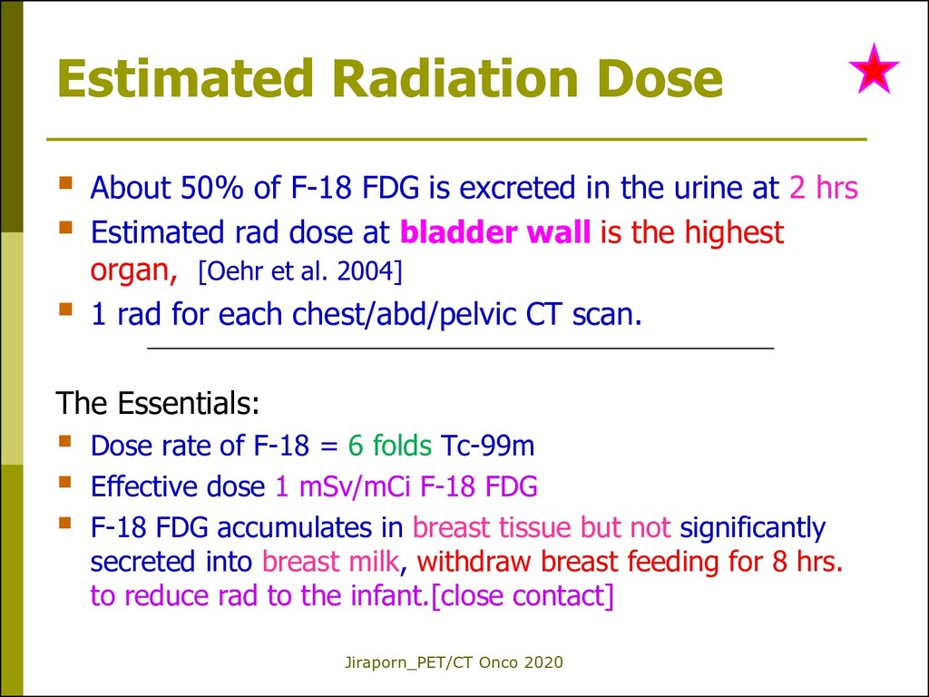 F-18 FDG is excreted in the urine at 2 hrs Estimated rad dose at bladder wall is the highest organ,. [Oehr et al. 2004] 1 rad for each chest/abd/pelvic CT scan. The Essentials: Dose rate of F-18 = 6 folds Tc-99m Effective dose 1 mSv/mCi F-18 FDG F-18 FDG accumulates in breast tissue but not significantly secreted into breast milk, withdraw breast feeding for 8 hrs. to reduce rad to the infant.[close contact]