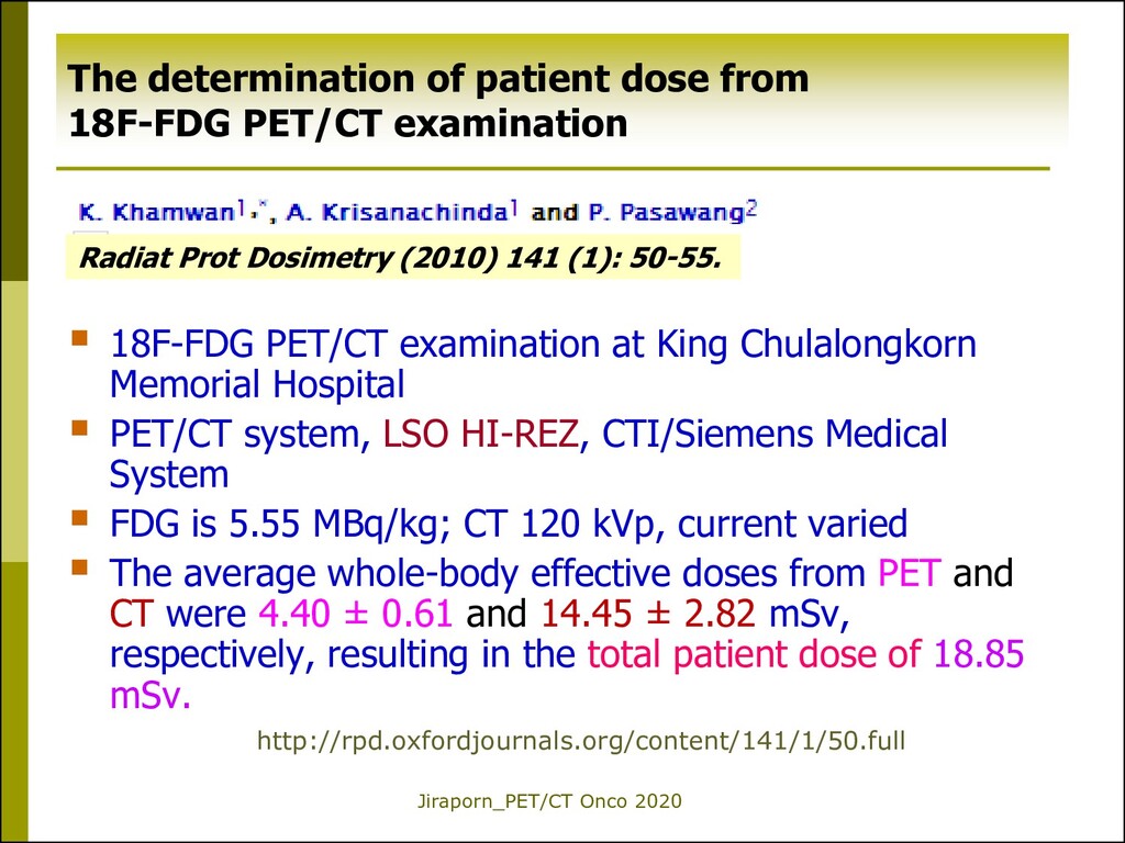 Memorial Hospital PET/CT system, LSO HI-REZ, CTI/Siemens Medical System FDG is 5.55 MBq/kg; CT 120 kVp, current varied The average whole-body effective doses from PET and CT were 4.40 ± 0.61 and 14.45 ± 2.82 mSv, respectively, resulting in the total patient dose of 18.85 mSv. http://rpd.oxfordjournals.org/content/141/1/50.full Radiat Prot Dosimetry (2010) 141 (1): 50-55. The determination of patient dose from 18F-FDG PET/CT examination