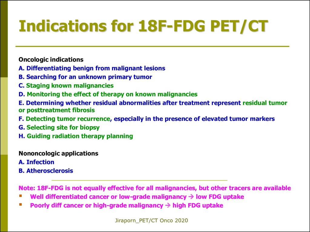 Differentiating benign from malignant lesions B. Searching for an unknown primary tumor C. Staging known malignancies D. Monitoring the effect of therapy on known malignancies E. Determining whether residual abnormalities after treatment represent residual tumor or posttreatment fibrosis F. Detecting tumor recurrence, especially in the presence of elevated tumor markers G. Selecting site for biopsy H. Guiding radiation therapy planning Nononcologic applications A. Infection B. Atherosclerosis Note: 18F-FDG is not equally effective for all malignancies, but other tracers are available Well differentiated cancer or low-grade malignancy low FDG uptake Poorly diff cancer or high-grade malignancy high FDG uptake